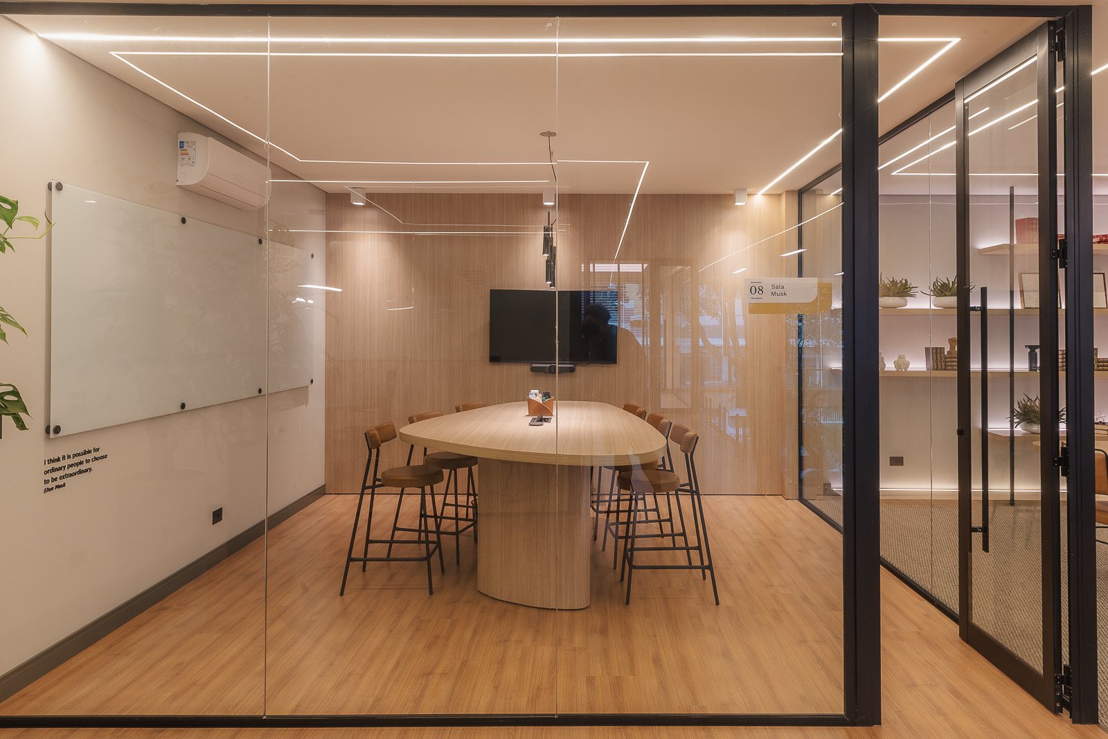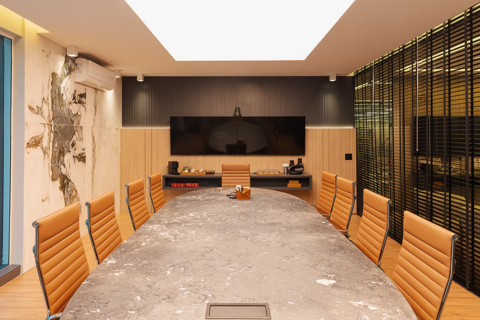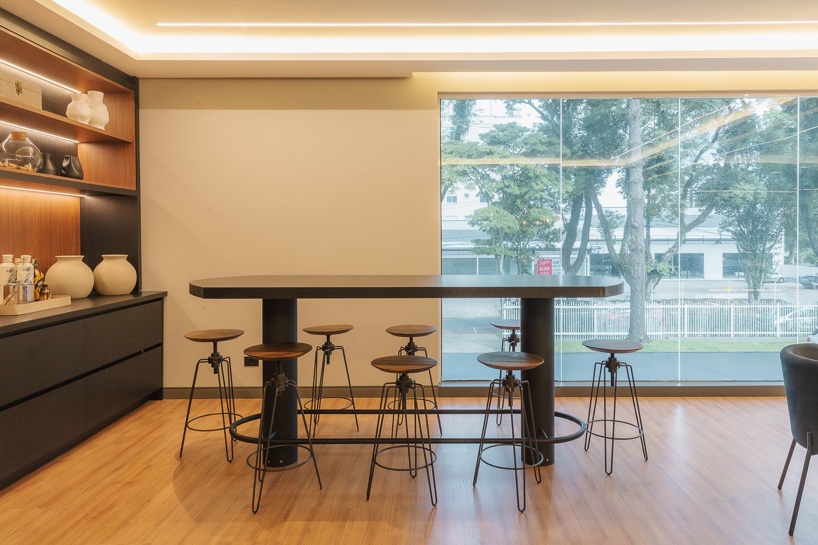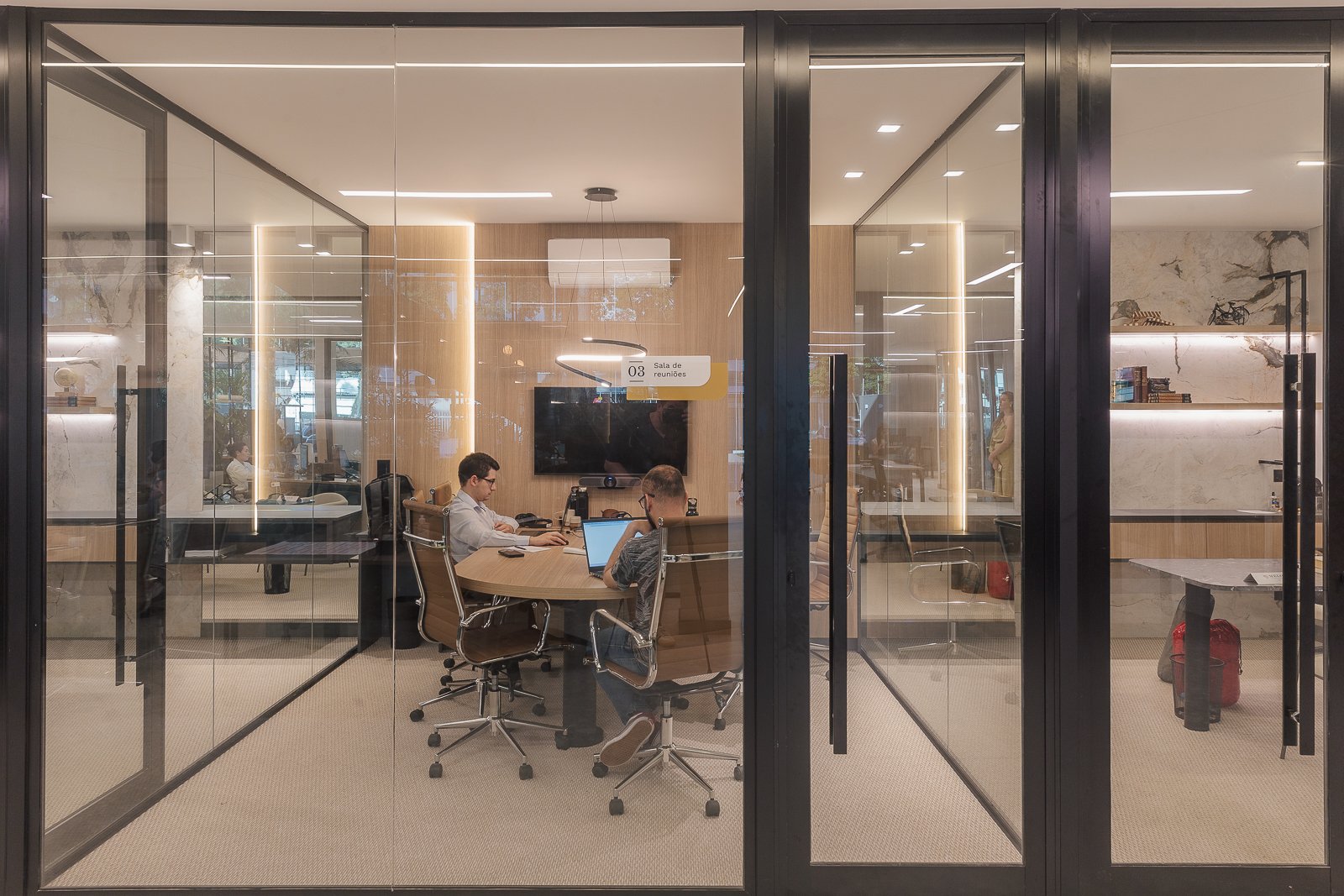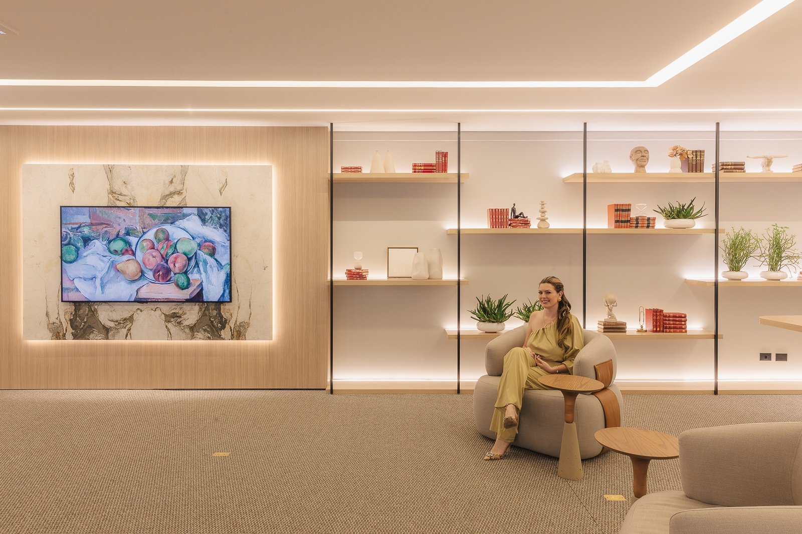 O projeto da nova sede do @meloadvogados.associados combina design biofílico e funcionalidade corporativa, refletindo inovação, confiança e bem-estar. A integração com a natureza, através de plantas como palmeiras e áreas envidraçadas que maximizam a luz natural, cria um ambiente agradável e reduz o estresse. O layout colaborativo, com mesas de formato orgânico e mobiliário que equilibra funcionalidade e estética, promove interação e harmonia entre os colaboradores em torno dos elementos verdes.