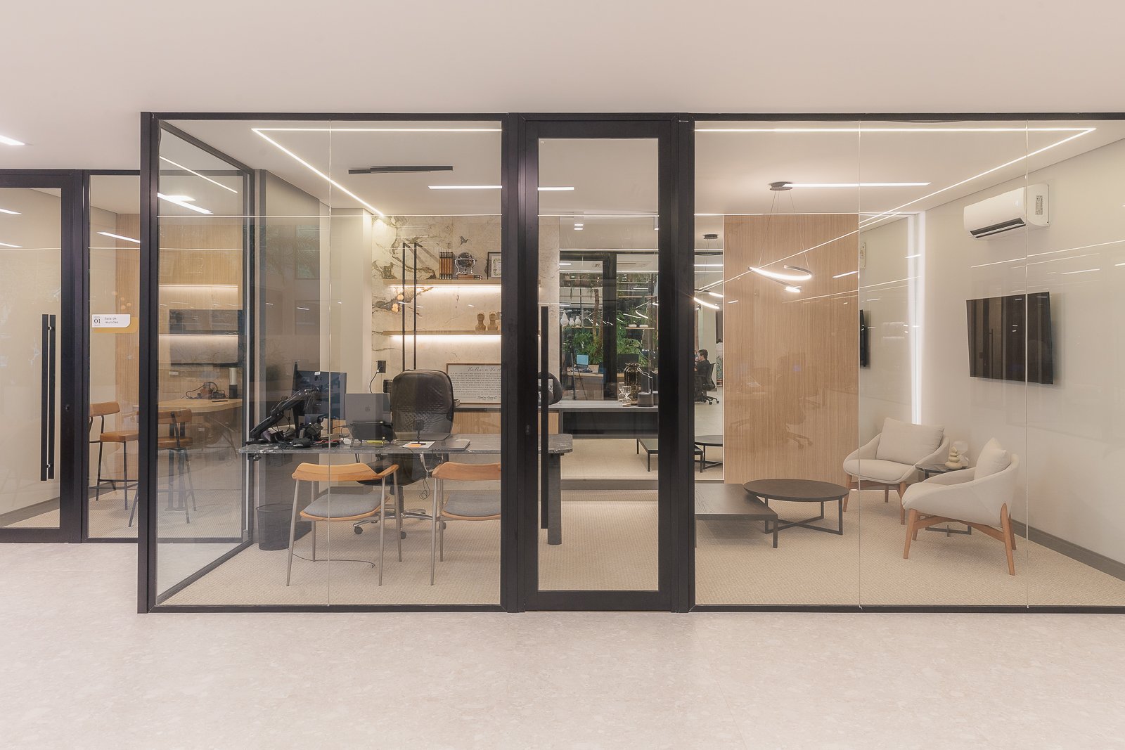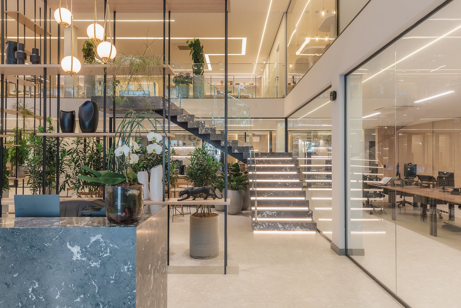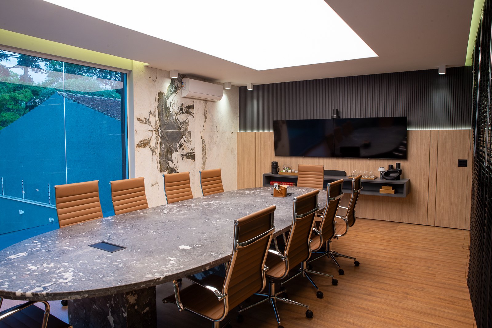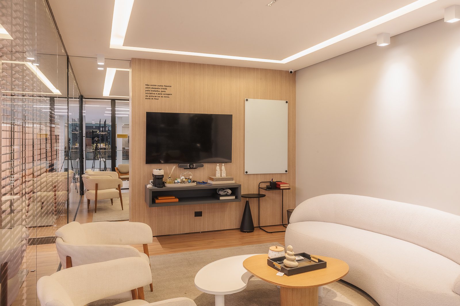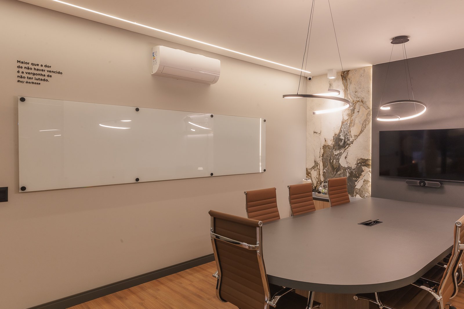 O projeto da nova sede do @meloadvogados.associados combina design biofílico e funcionalidade corporativa, refletindo inovação, confiança e bem-estar. A integração com a natureza, através de plantas como palmeiras e áreas envidraçadas que maximizam a luz natural, cria um ambiente agradável e reduz o estresse. O layout colaborativo, com mesas de formato orgânico e mobiliário que equilibra funcionalidade e estética, promove interação e harmonia entre os colaboradores em torno dos elementos verdes.