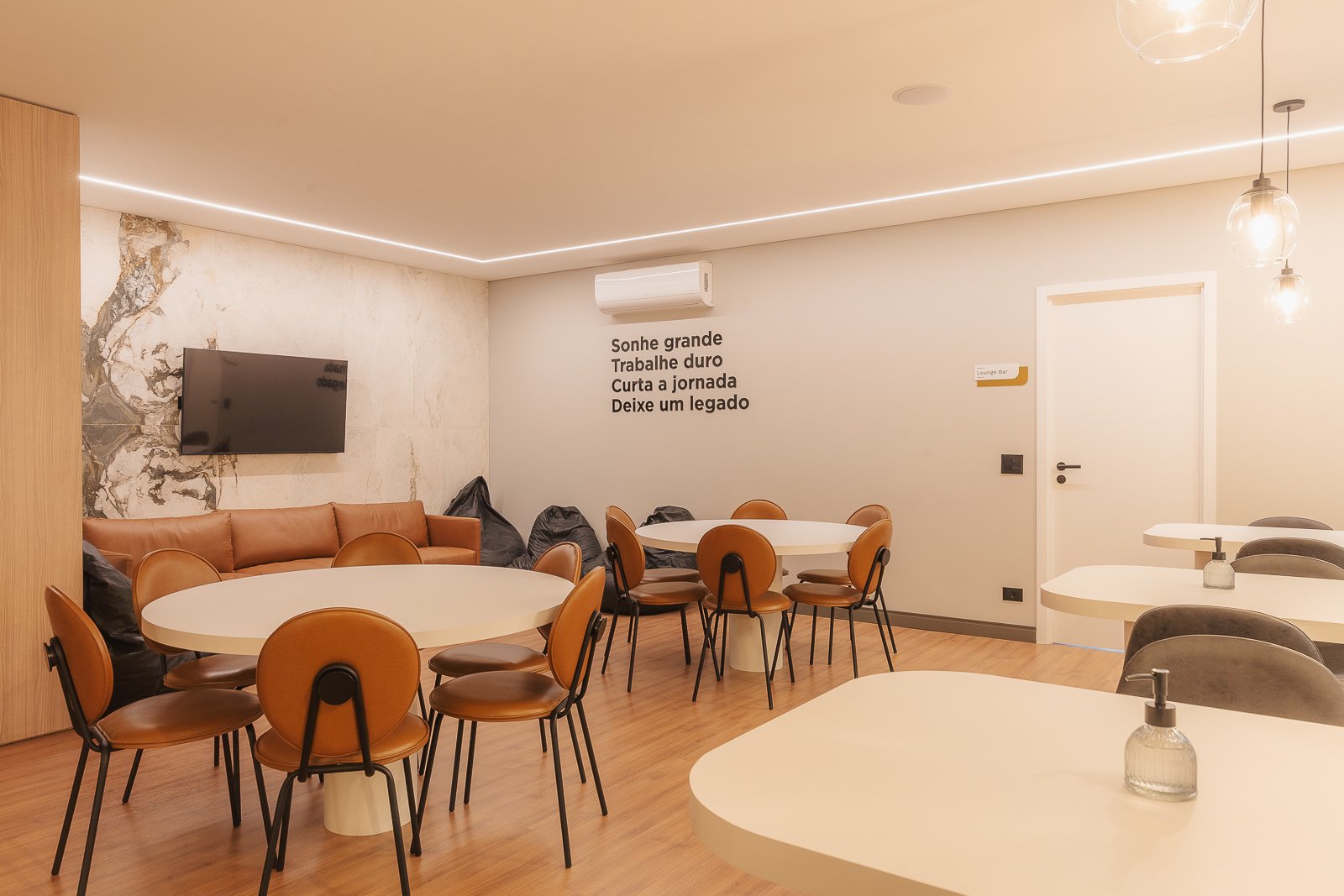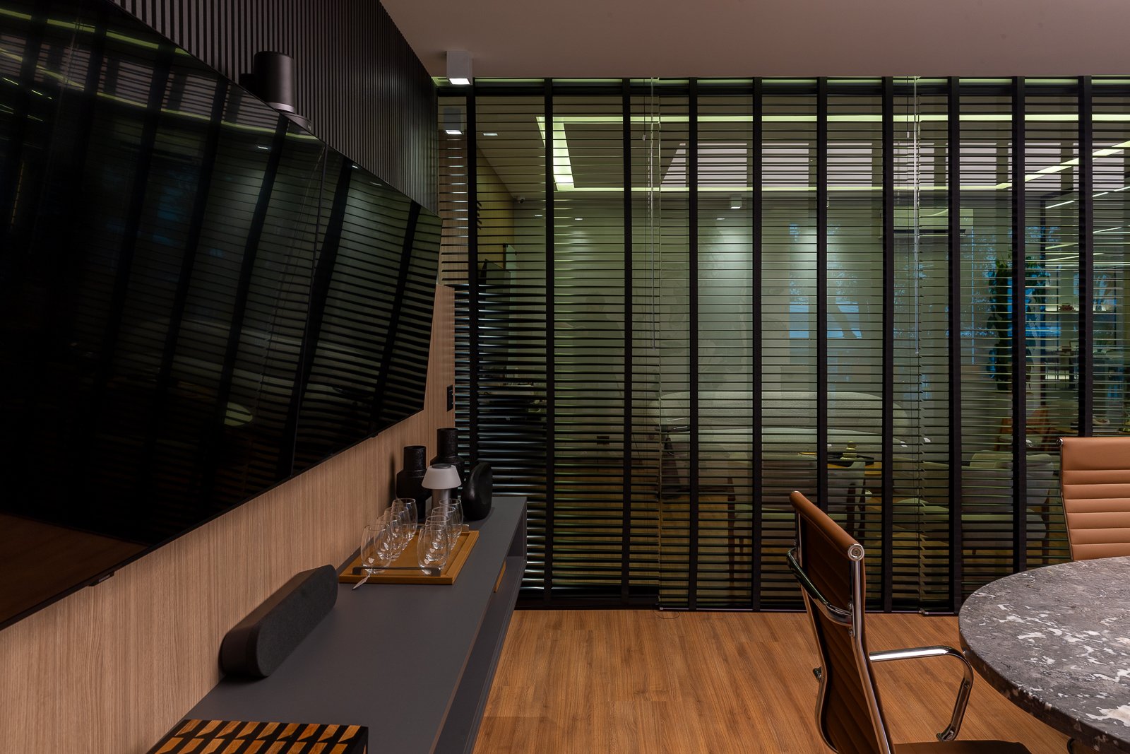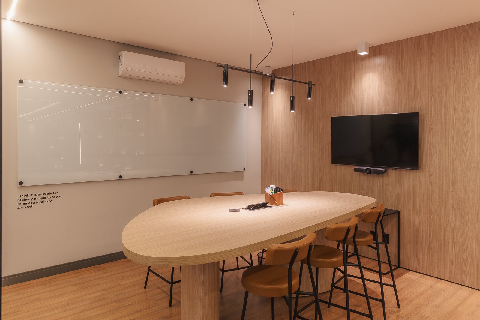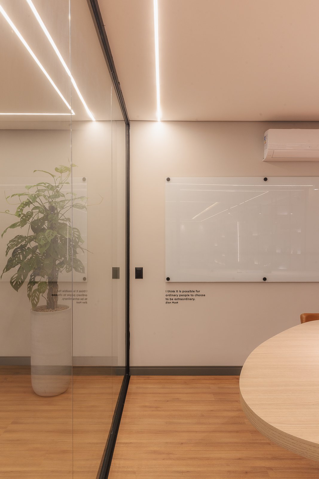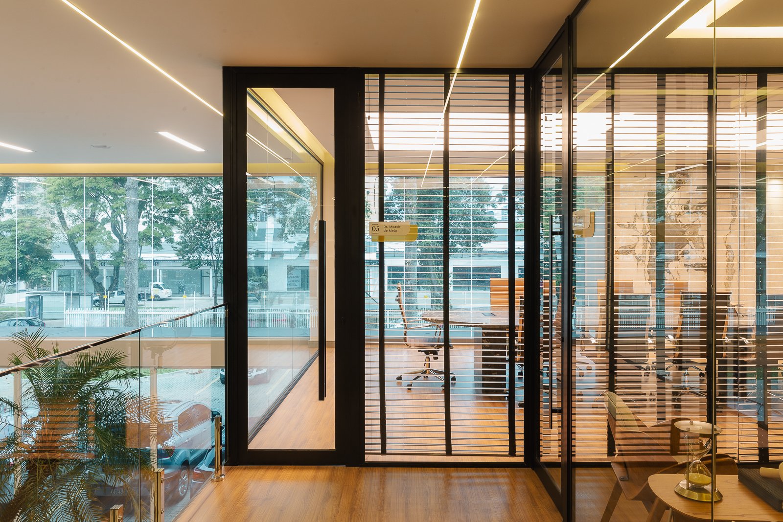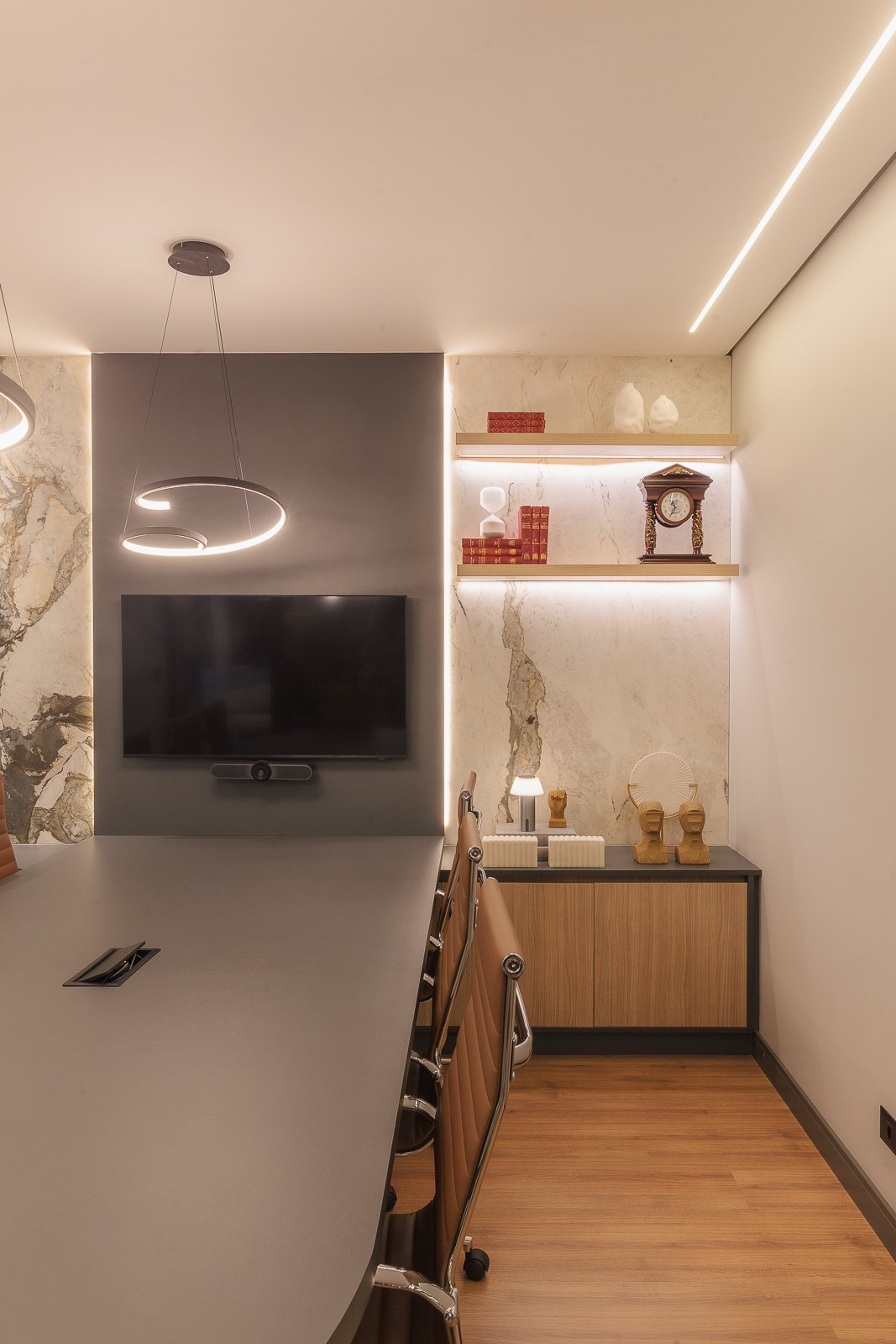 O projeto da nova sede do @meloadvogados.associados combina design biofílico e funcionalidade corporativa, refletindo inovação, confiança e bem-estar. A integração com a natureza, através de plantas como palmeiras e áreas envidraçadas que maximizam a luz natural, cria um ambiente agradável e reduz o estresse. O layout colaborativo, com mesas de formato orgânico e mobiliário que equilibra funcionalidade e estética, promove interação e harmonia entre os colaboradores em torno dos elementos verdes.
