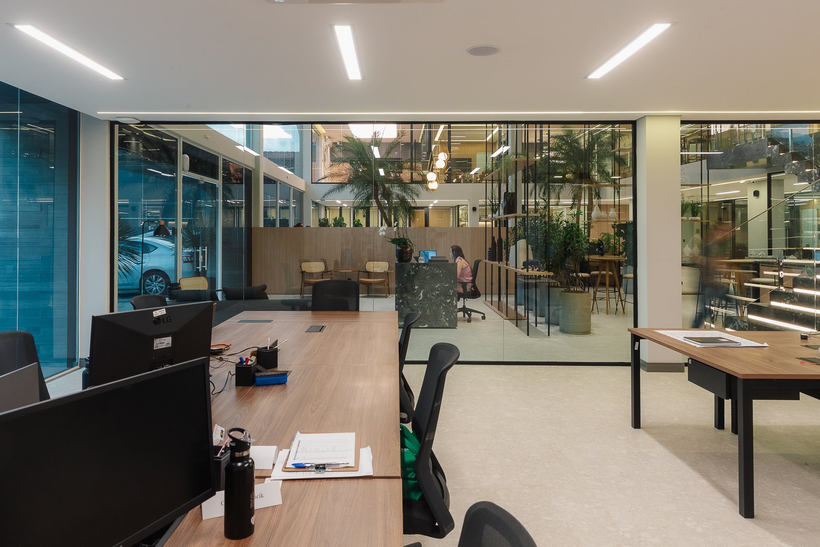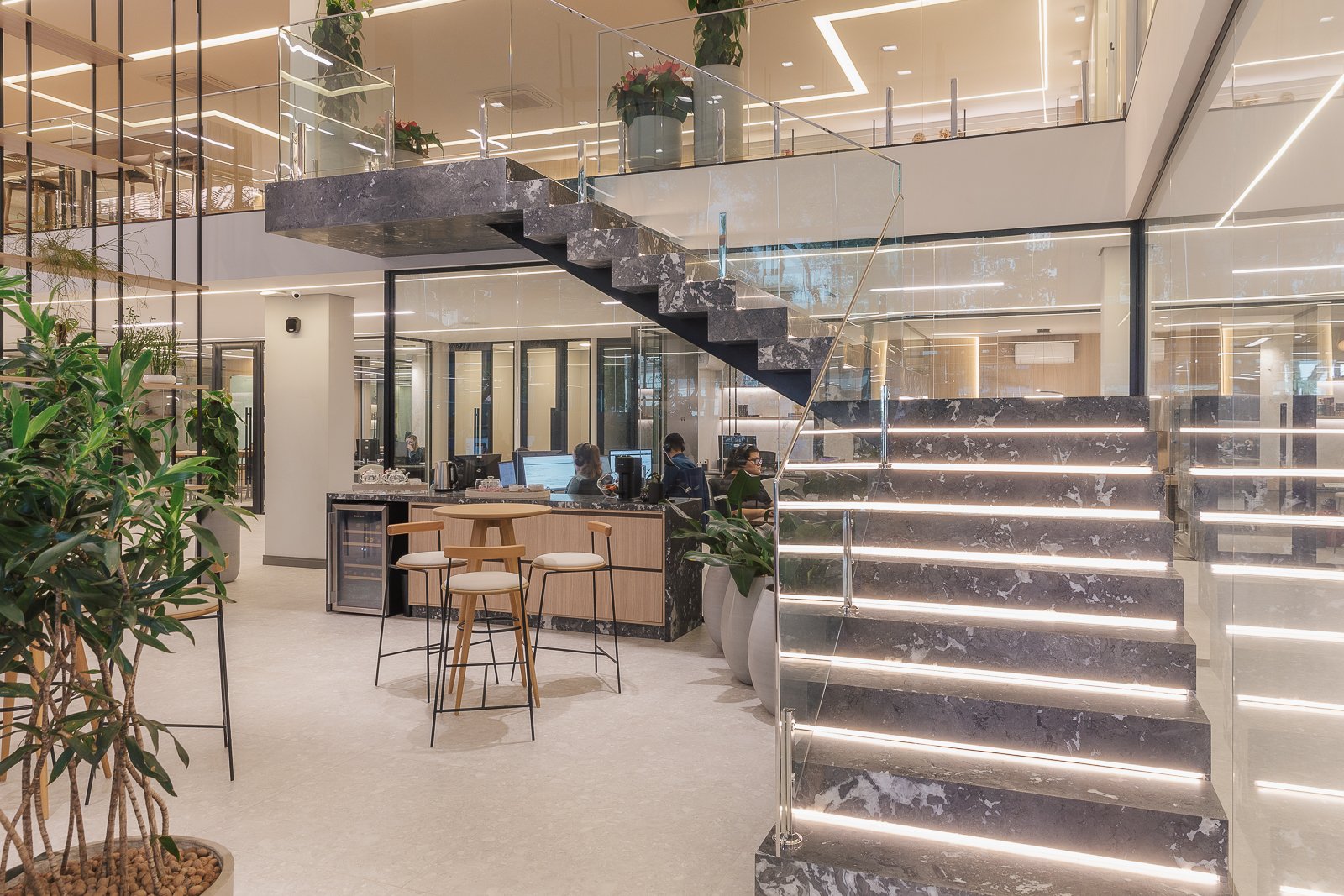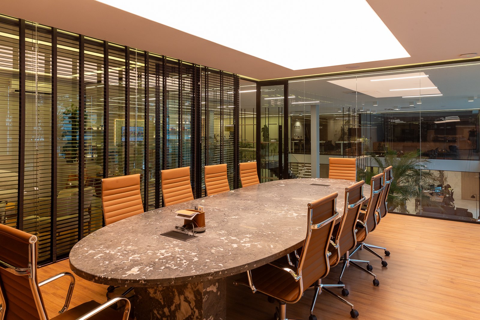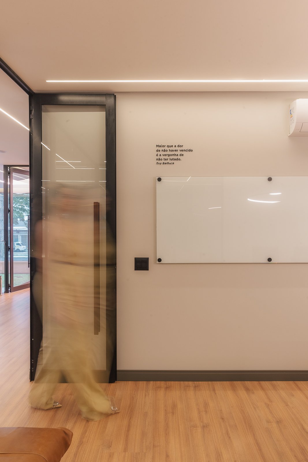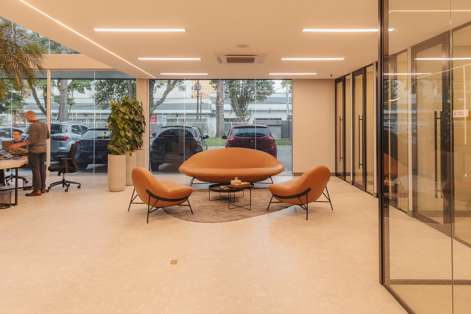 O projeto da nova sede do @meloadvogados.associados combina design biofílico e funcionalidade corporativa, refletindo inovação, confiança e bem-estar. A integração com a natureza, através de plantas como palmeiras e áreas envidraçadas que maximizam a luz natural, cria um ambiente agradável e reduz o estresse. O layout colaborativo, com mesas de formato orgânico e mobiliário que equilibra funcionalidade e estética, promove interação e harmonia entre os colaboradores em torno dos elementos verdes.