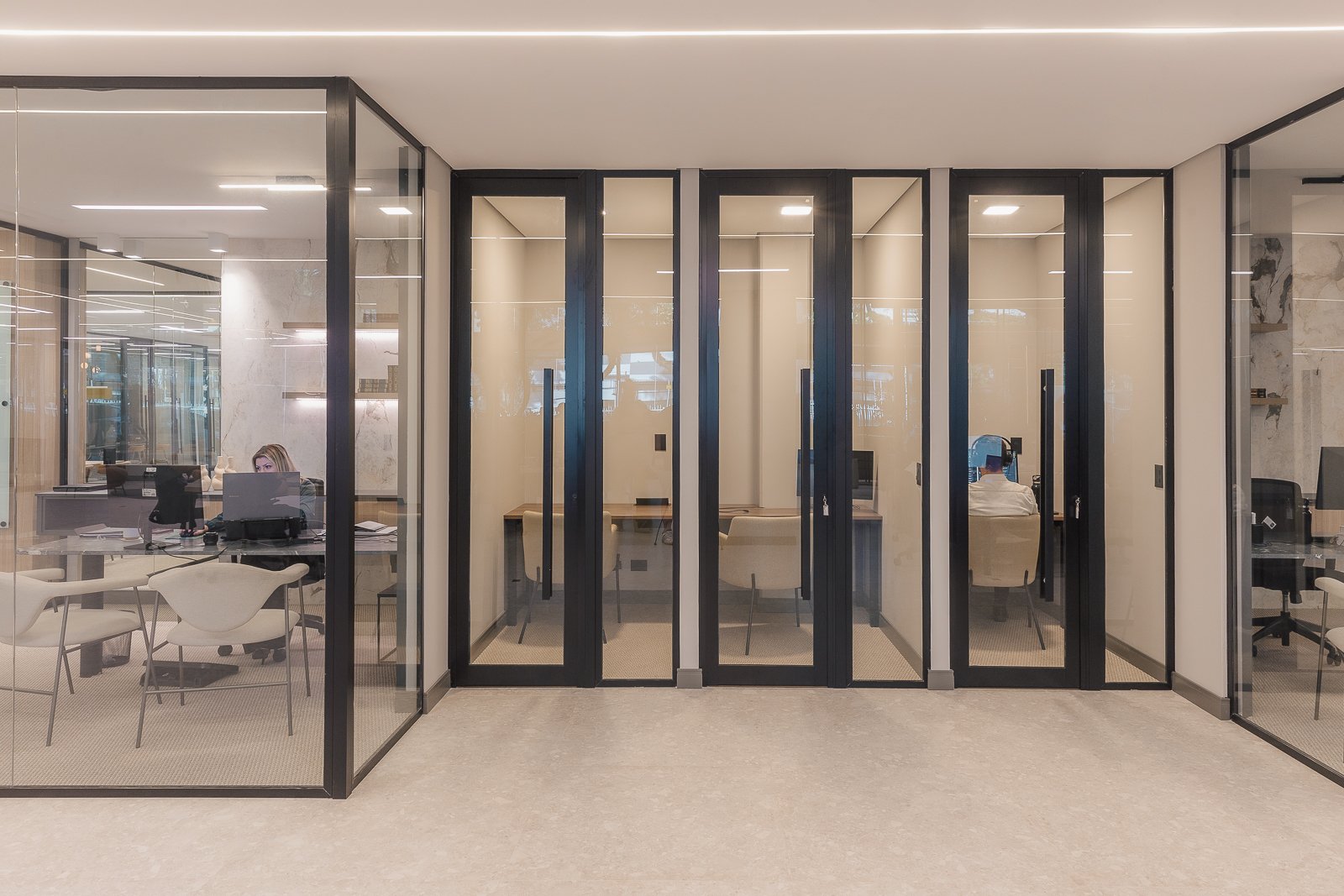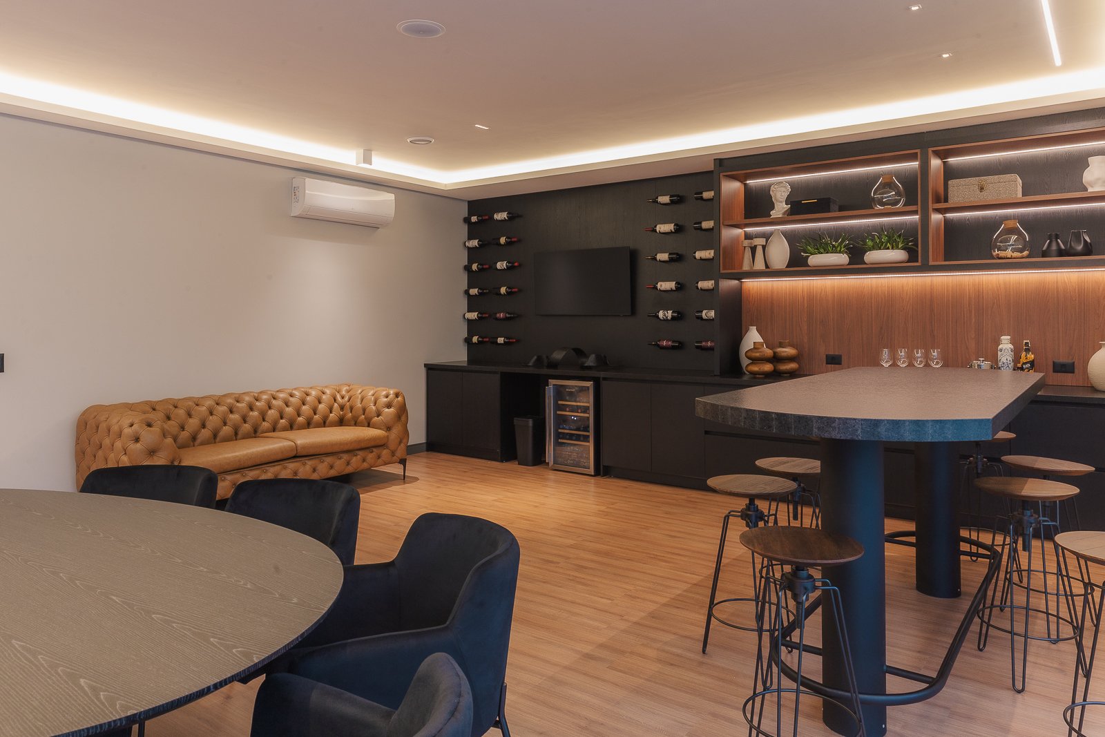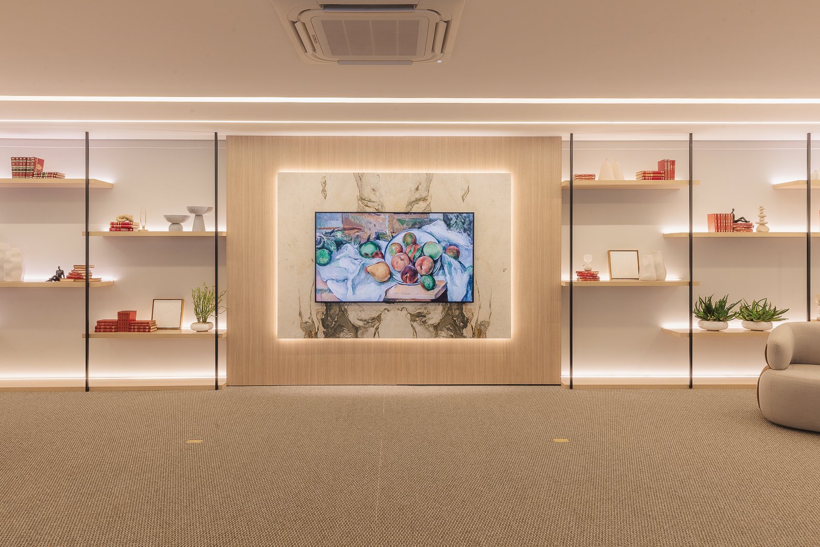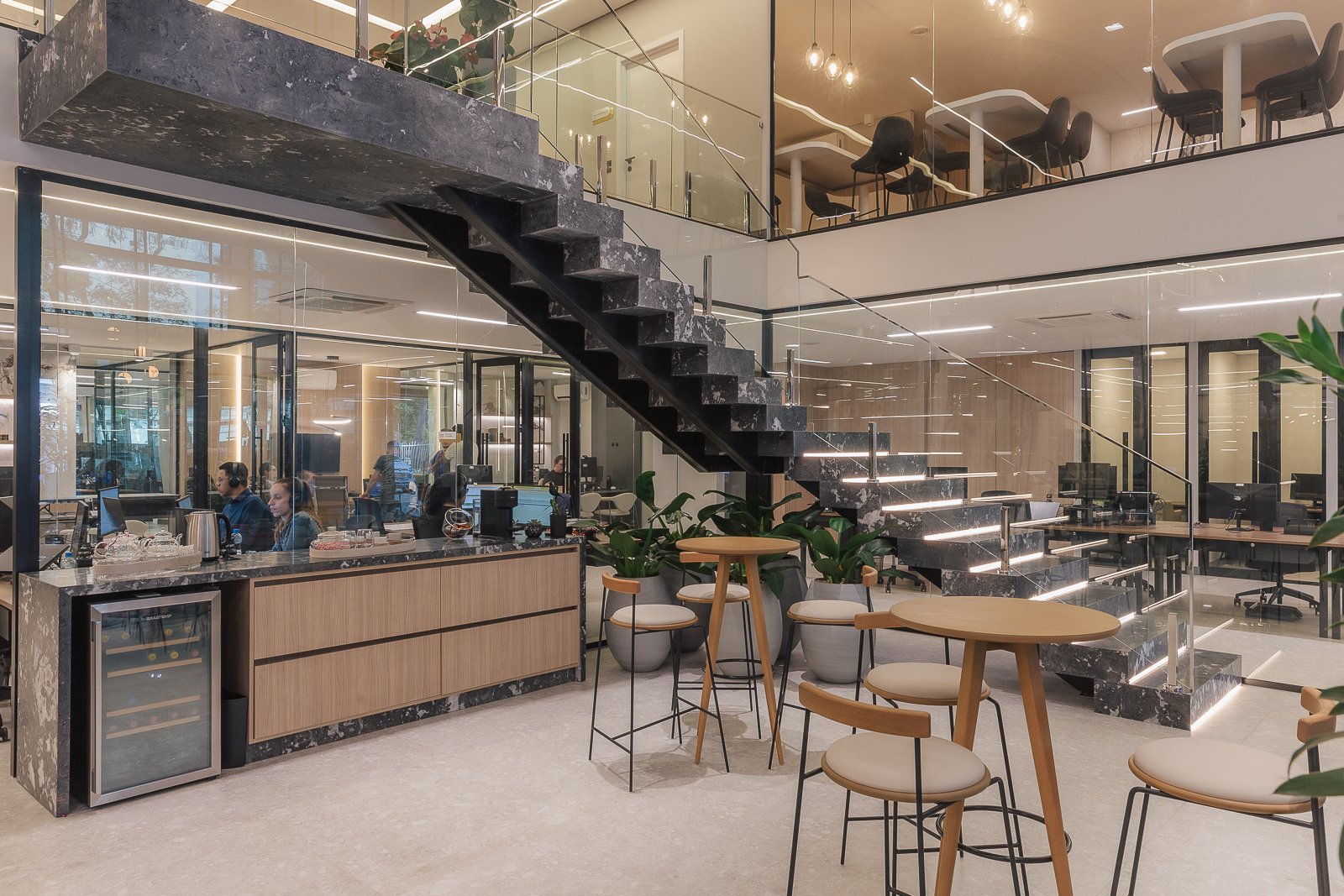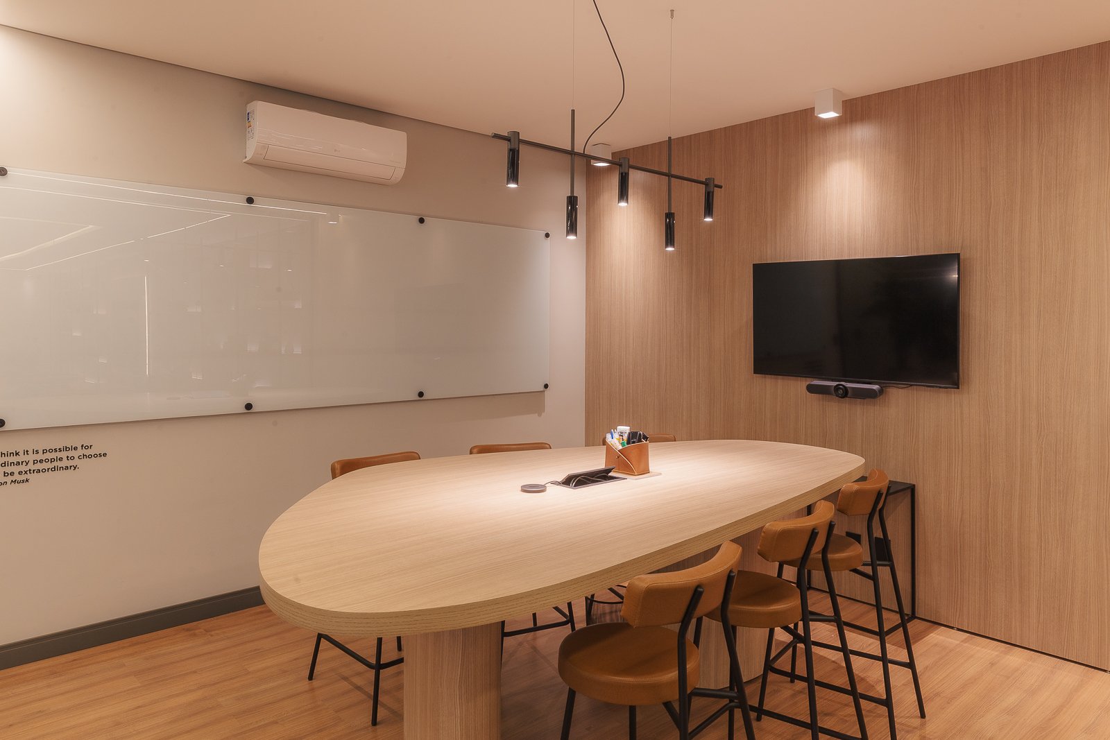 O projeto da nova sede do @meloadvogados.associados combina design biofílico e funcionalidade corporativa, refletindo inovação, confiança e bem-estar. A integração com a natureza, através de plantas como palmeiras e áreas envidraçadas que maximizam a luz natural, cria um ambiente agradável e reduz o estresse. O layout colaborativo, com mesas de formato orgânico e mobiliário que equilibra funcionalidade e estética, promove interação e harmonia entre os colaboradores em torno dos elementos verdes.