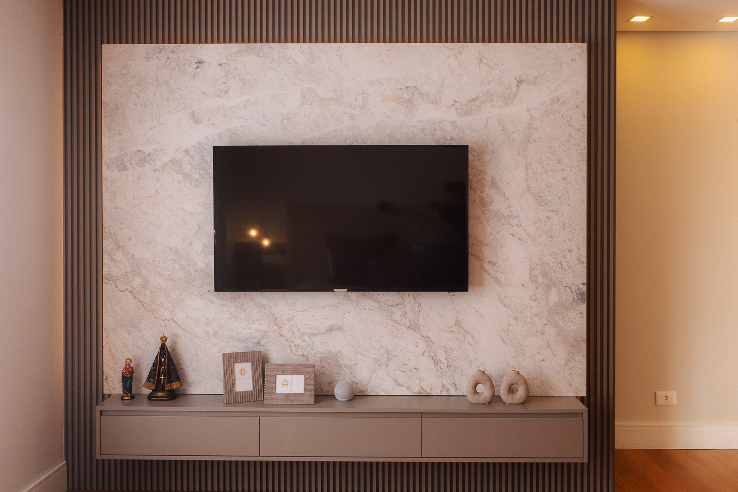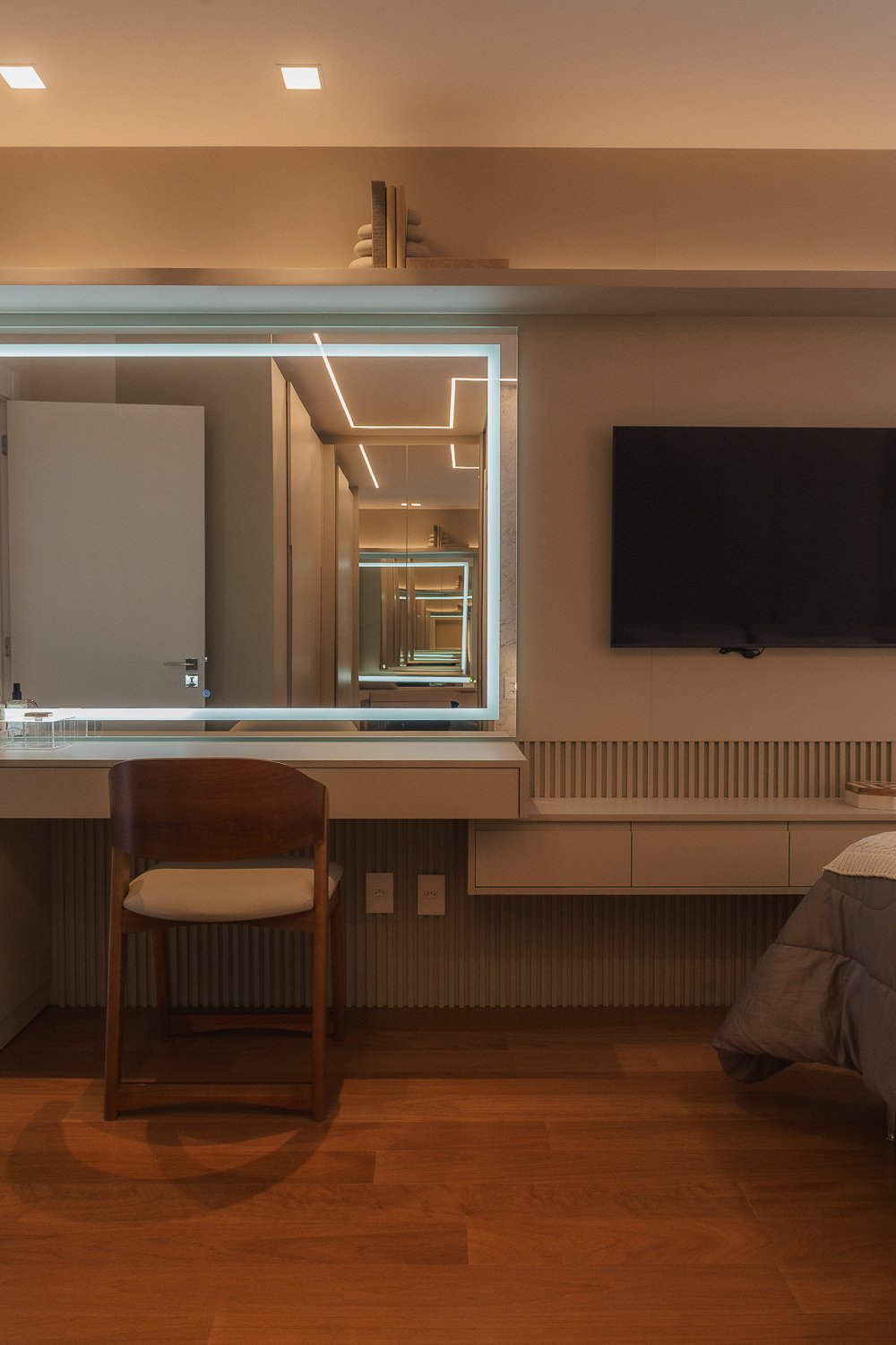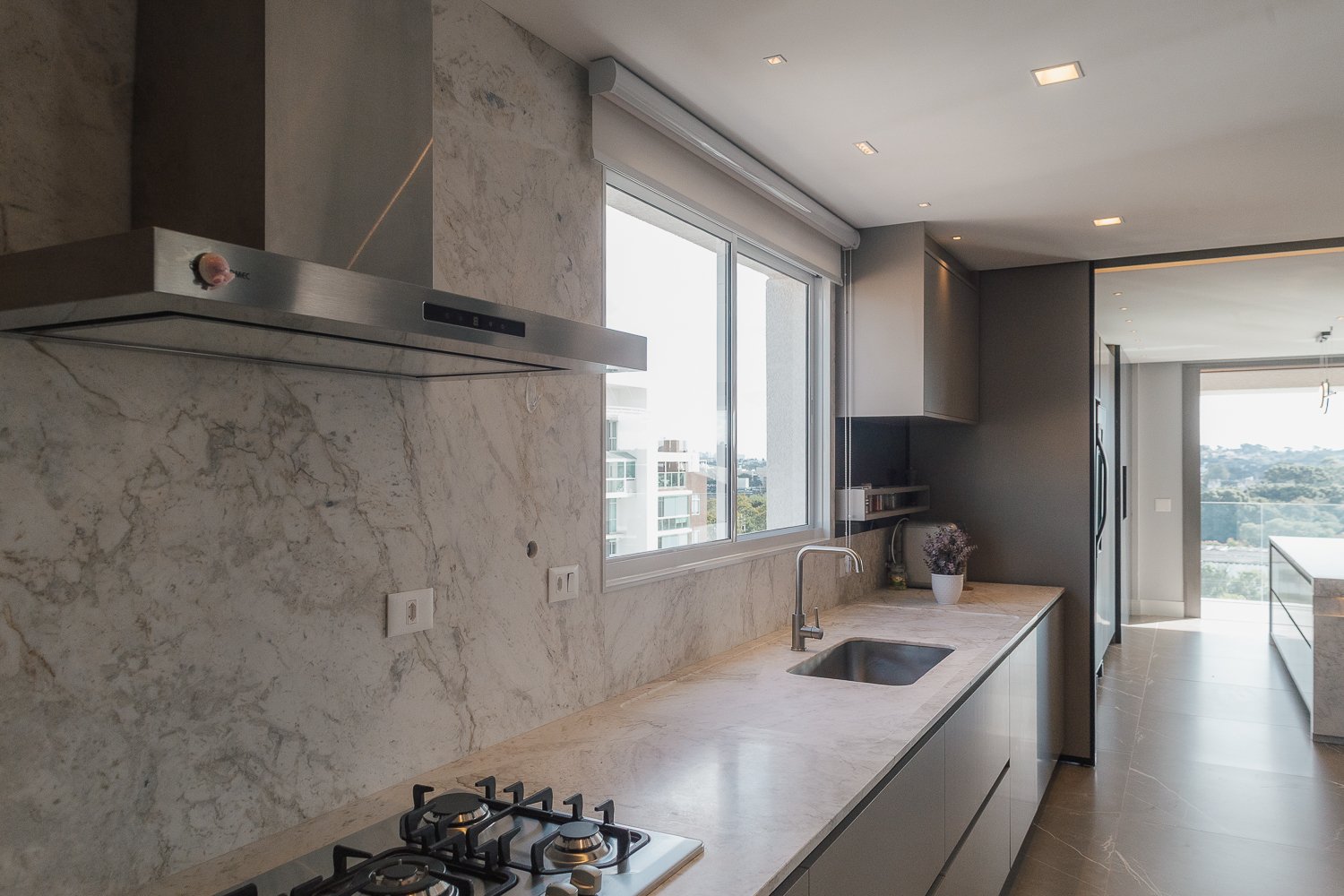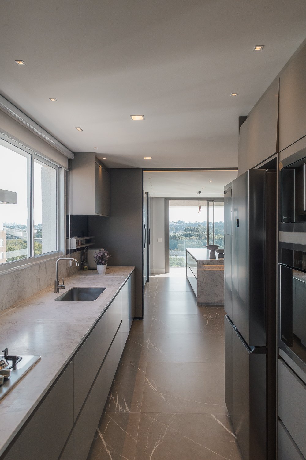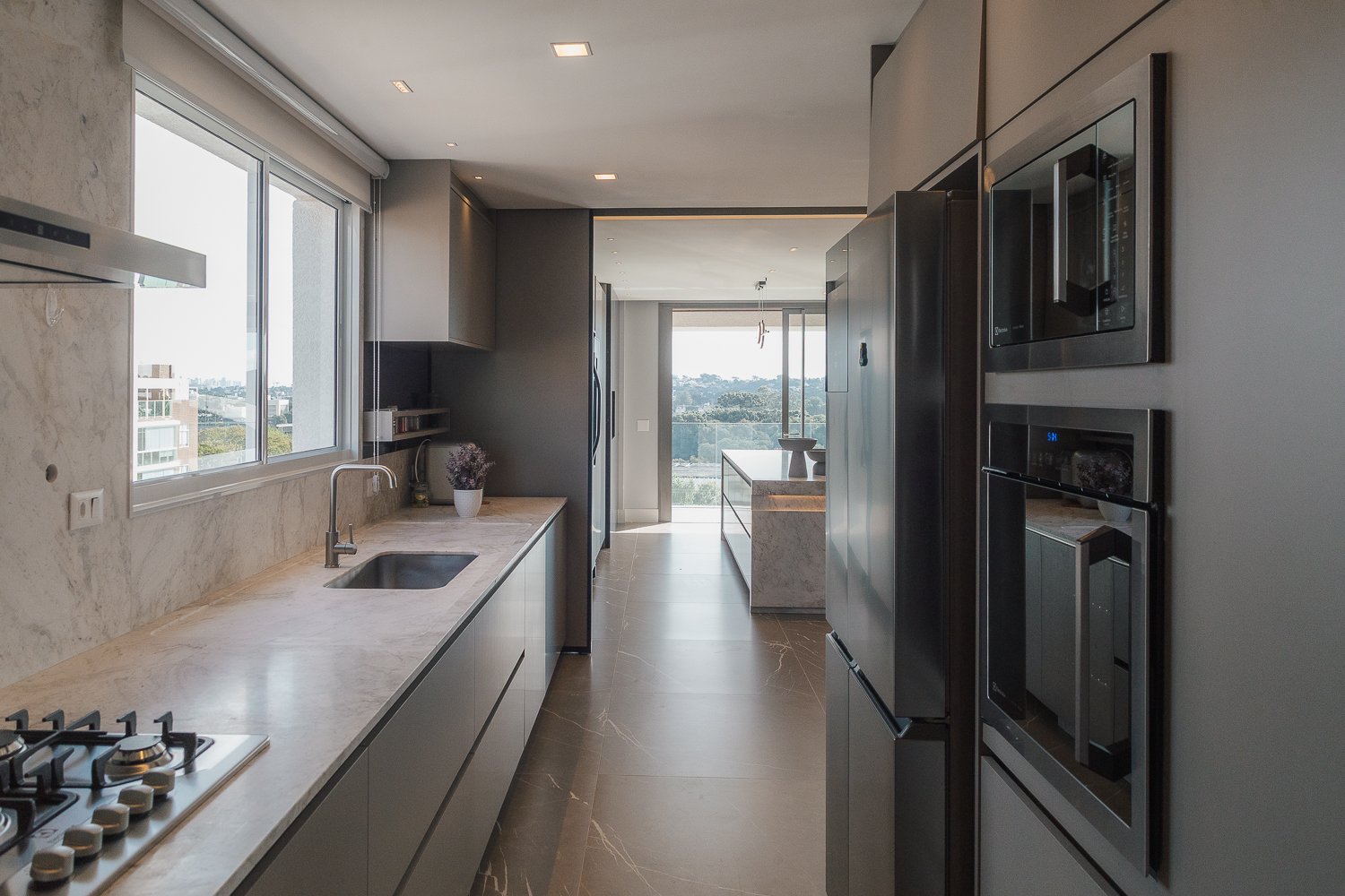 Nesse projeto de interiores que assinamos para esse apartamento apostamos em tons sóbrios, iluminação bem posicionada, uma composição entre dois tons de marmores e madeira natural. Esse conjunto de acabamentos no resultado final do projeto ficou com a essência que a família queria para a nova moradia, um lar aconchegante. A sala de TV alia conforto e elegância em um espaço contemporâneo com paleta neutra, sofá amplo em “L” e marcenaria sob medida. A iluminação indireta e o espelho ampliam o ambiente, enquanto os detalhes em madeira, preto e objetos decorativos trazem sofisticação e acolhimento. Um projeto funcional, fluido e visualmente equilibrado. Esta cozinha revela um projeto contemporâneo marcado pela elegância minimalista e funcionalidade. Os tons neutros predominam nos armários em acabamento fosco, que contrastam com o mármore claro das bancadas e paredes, conferindo sofisticação e atemporalidade ao espaço. A iluminação embutida no teto garante um ambiente bem iluminado, valorizando cada detalhe da marcenaria e do revestimento. A ampla janela permite entrada generosa de luz natural, além de oferecer uma vista livre, que amplia a sensação de espaço. O layout linear otimiza a circulação e a ergonomia no uso diário, com eletrodomésticos embutidos e organizados de forma eficiente. O visual limpo, sem puxadores aparentes, reforça o estilo moderno, enquanto os acabamentos de qualidade evidenciam o cuidado com cada escolha.