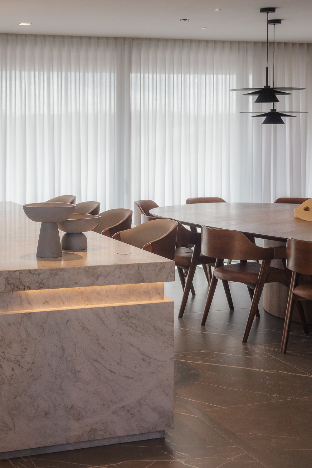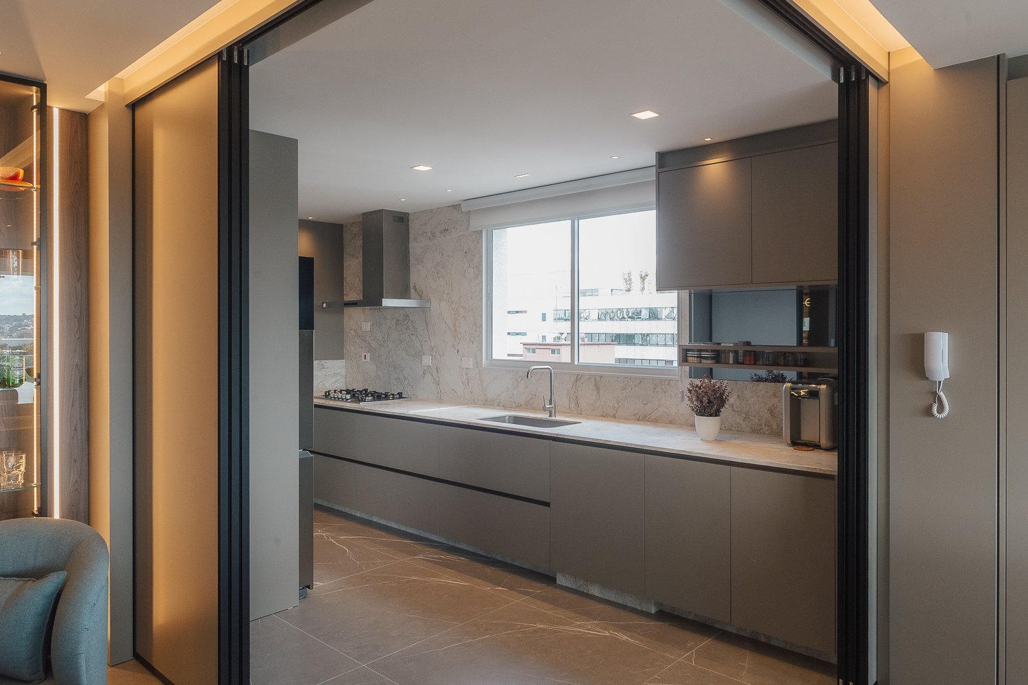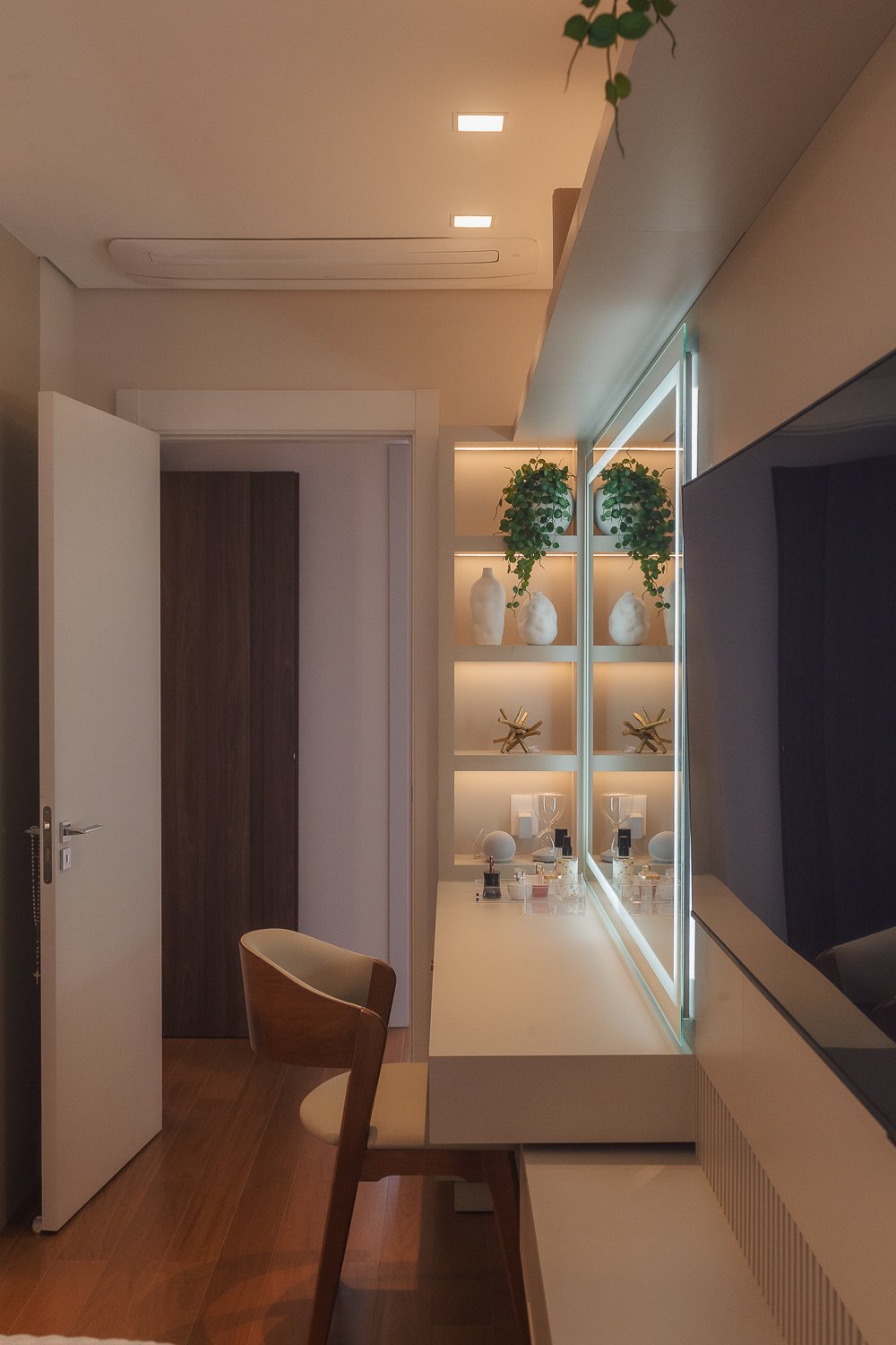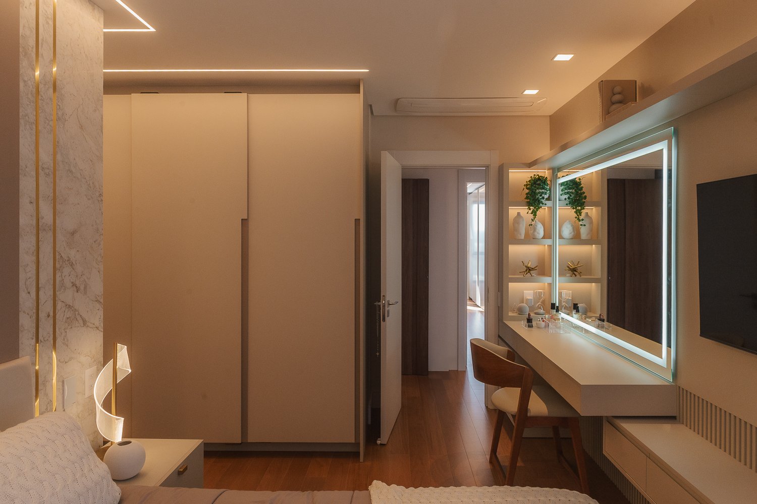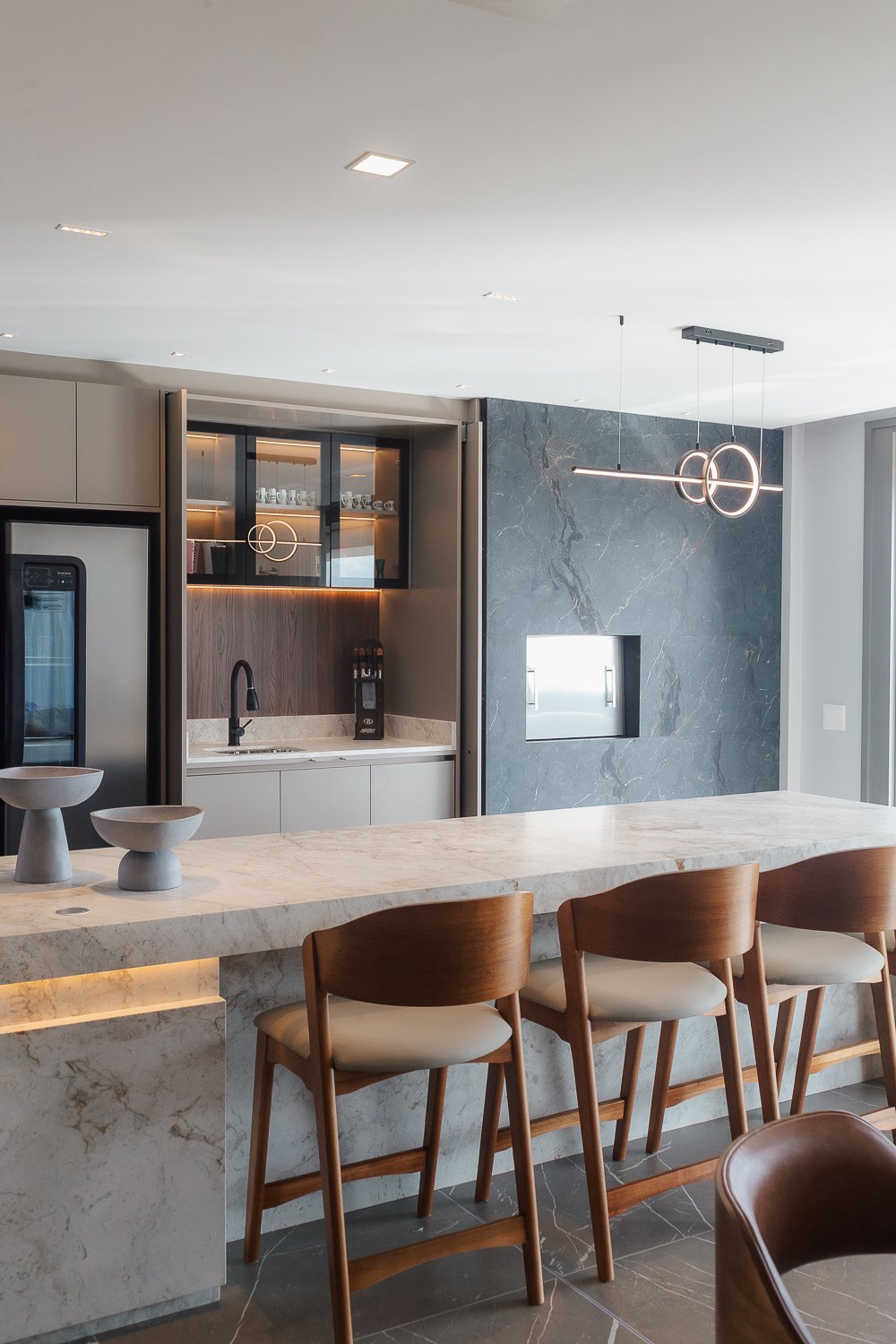 Nesse projeto de interiores que assinamos para esse apartamento apostamos em tons sóbrios, iluminação bem posicionada, uma composição entre dois tons de marmores e madeira natural. Esse conjunto de acabamentos no resultado final do projeto ficou com a essência que a família queria para a nova moradia, um lar aconchegante. A sala de TV alia conforto e elegância em um espaço contemporâneo com paleta neutra, sofá amplo em “L” e marcenaria sob medida. A iluminação indireta e o espelho ampliam o ambiente, enquanto os detalhes em madeira, preto e objetos decorativos trazem sofisticação e acolhimento. Um projeto funcional, fluido e visualmente equilibrado. Esta cozinha revela um projeto contemporâneo marcado pela elegância minimalista e funcionalidade. Os tons neutros predominam nos armários em acabamento fosco, que contrastam com o mármore claro das bancadas e paredes, conferindo sofisticação e atemporalidade ao espaço. A iluminação embutida no teto garante um ambiente bem iluminado, valorizando cada detalhe da marcenaria e do revestimento. A ampla janela permite entrada generosa de luz natural, além de oferecer uma vista livre, que amplia a sensação de espaço. O layout linear otimiza a circulação e a ergonomia no uso diário, com eletrodomésticos embutidos e organizados de forma eficiente. O visual limpo, sem puxadores aparentes, reforça o estilo moderno, enquanto os acabamentos de qualidade evidenciam o cuidado com cada escolha.