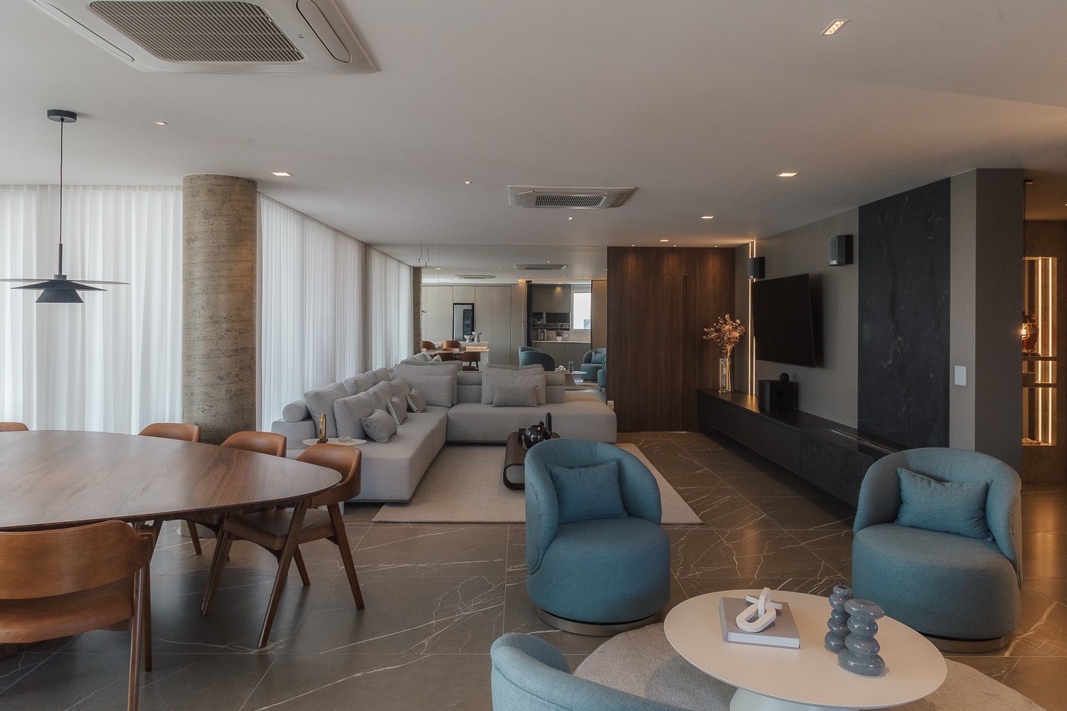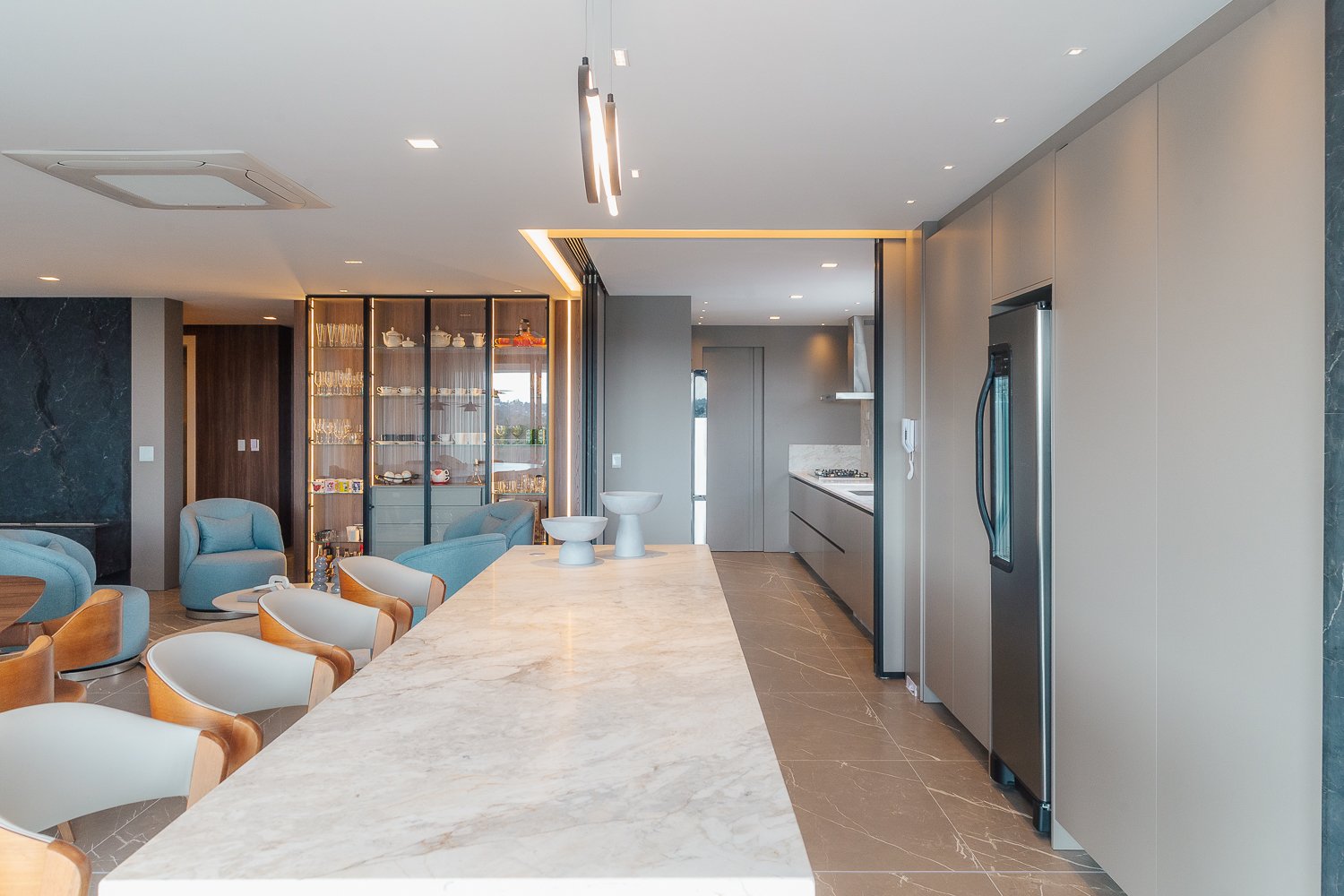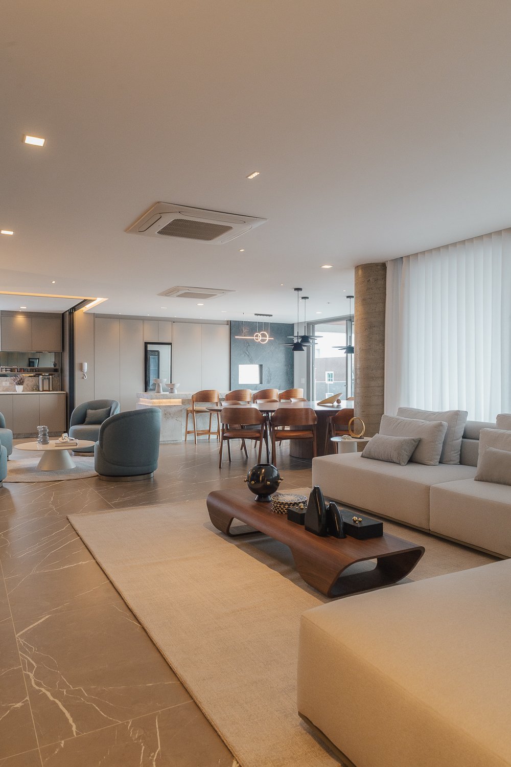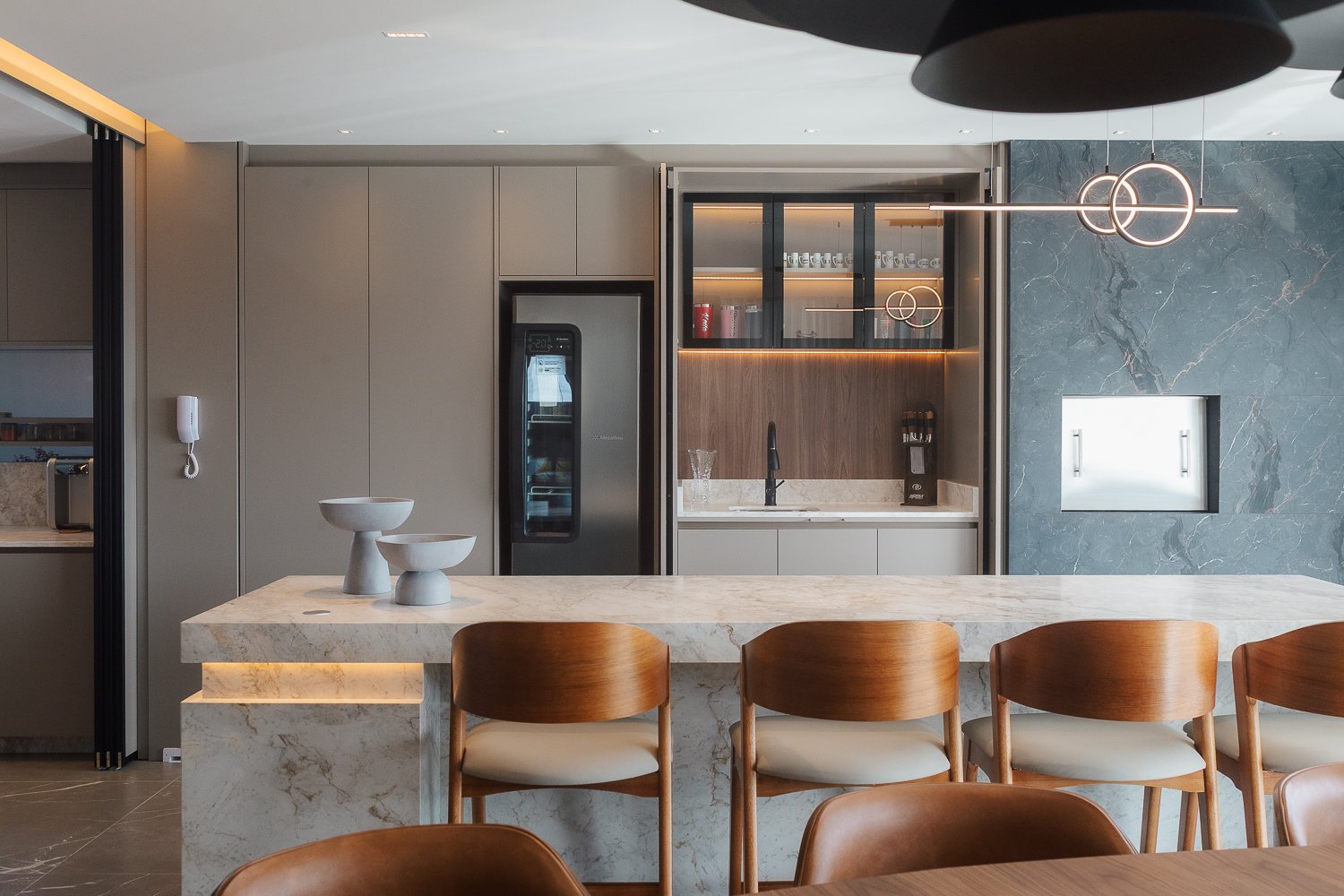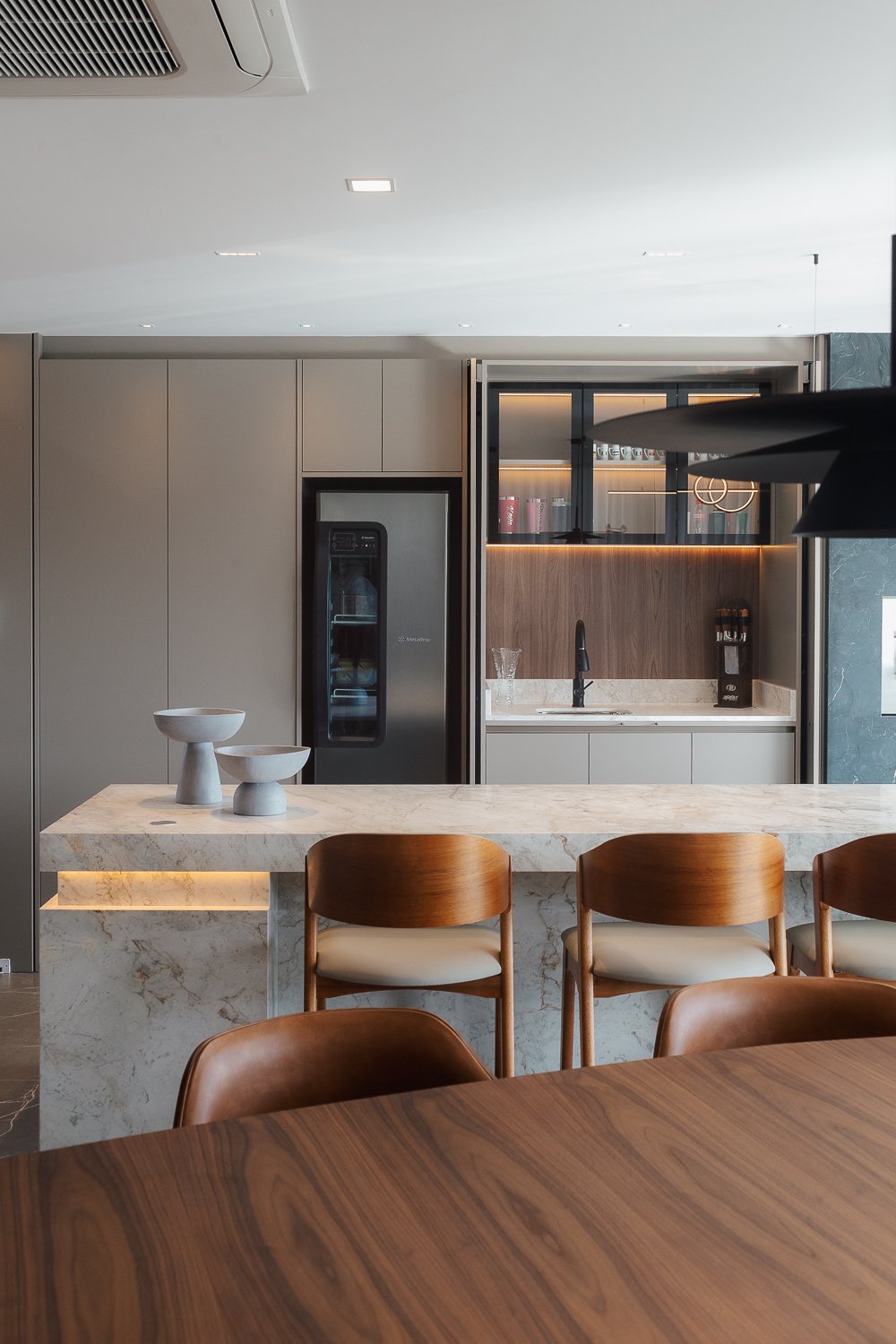 Nesse projeto de interiores que assinamos para esse apartamento apostamos em tons sóbrios, iluminação bem posicionada, uma composição entre dois tons de marmores e madeira natural. Esse conjunto de acabamentos no resultado final do projeto ficou com a essência que a família queria para a nova moradia, um lar aconchegante. A sala de TV alia conforto e elegância em um espaço contemporâneo com paleta neutra, sofá amplo em “L” e marcenaria sob medida. A iluminação indireta e o espelho ampliam o ambiente, enquanto os detalhes em madeira, preto e objetos decorativos trazem sofisticação e acolhimento. Um projeto funcional, fluido e visualmente equilibrado. Esta cozinha revela um projeto contemporâneo marcado pela elegância minimalista e funcionalidade. Os tons neutros predominam nos armários em acabamento fosco, que contrastam com o mármore claro das bancadas e paredes, conferindo sofisticação e atemporalidade ao espaço. A iluminação embutida no teto garante um ambiente bem iluminado, valorizando cada detalhe da marcenaria e do revestimento. A ampla janela permite entrada generosa de luz natural, além de oferecer uma vista livre, que amplia a sensação de espaço. O layout linear otimiza a circulação e a ergonomia no uso diário, com eletrodomésticos embutidos e organizados de forma eficiente. O visual limpo, sem puxadores aparentes, reforça o estilo moderno, enquanto os acabamentos de qualidade evidenciam o cuidado com cada escolha.