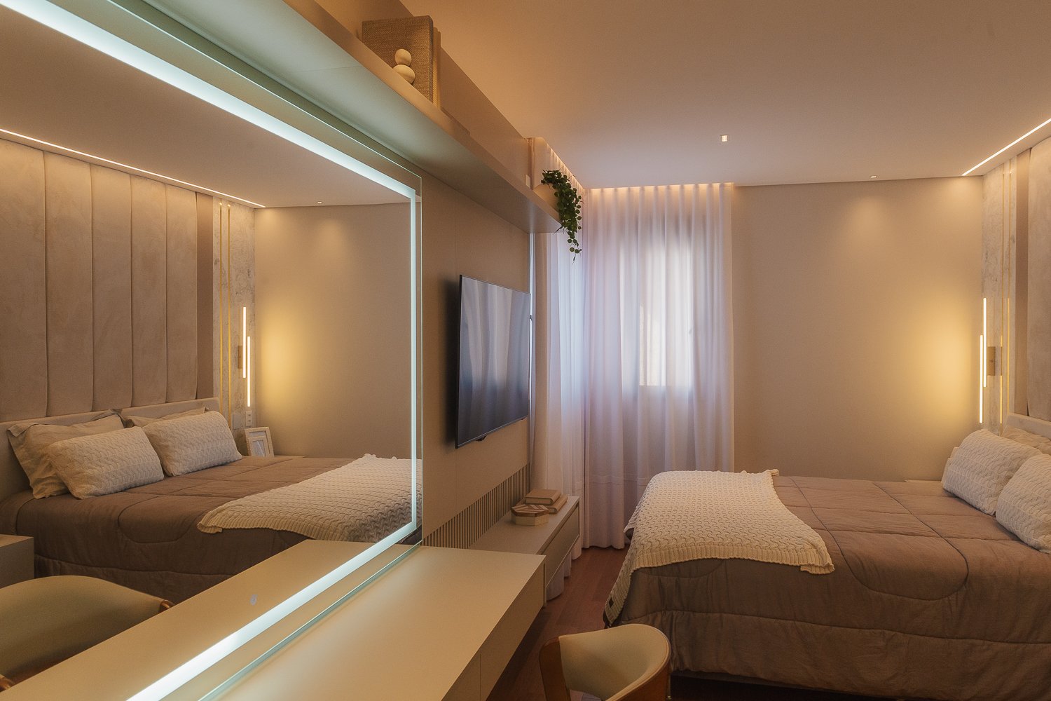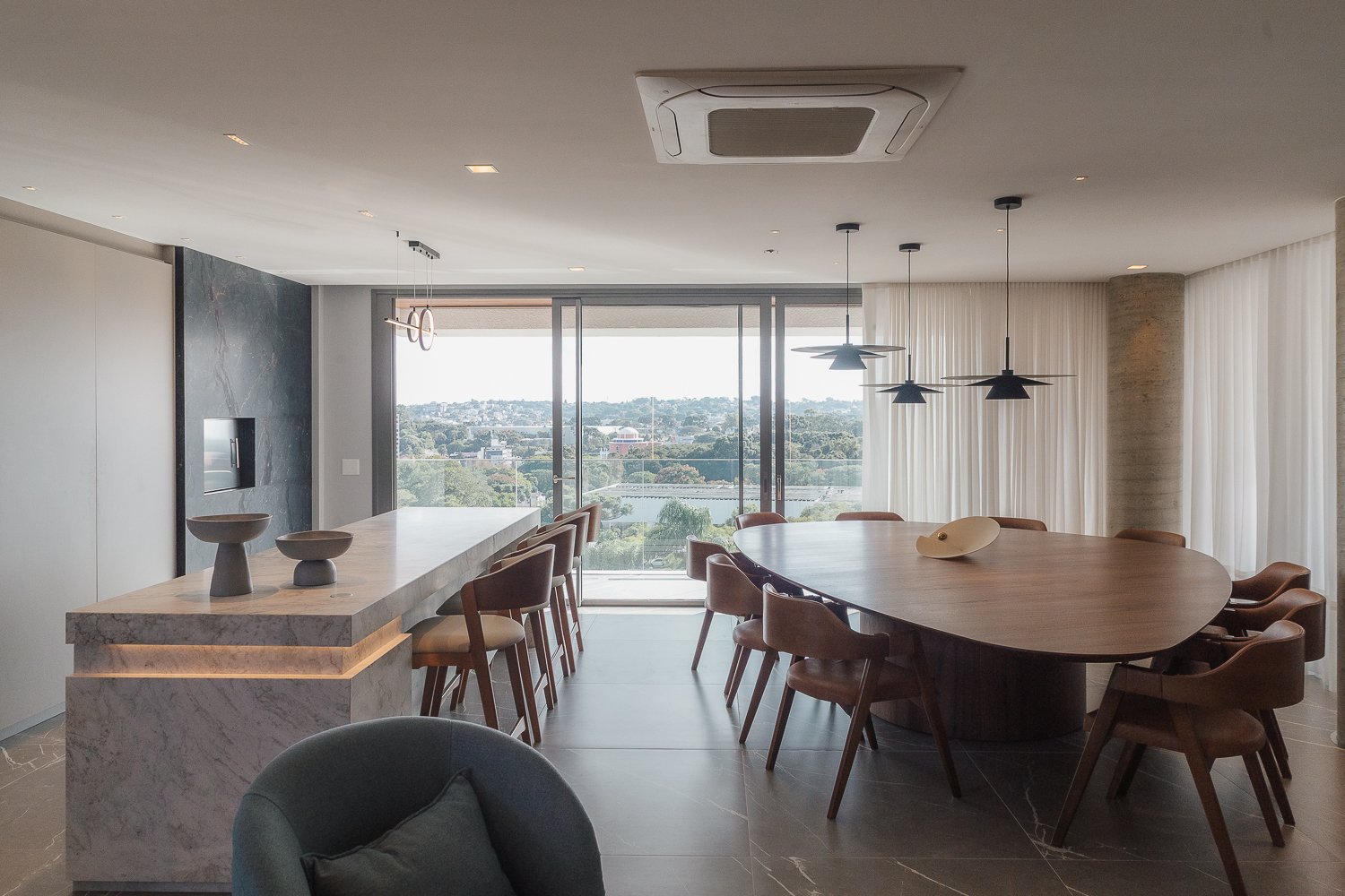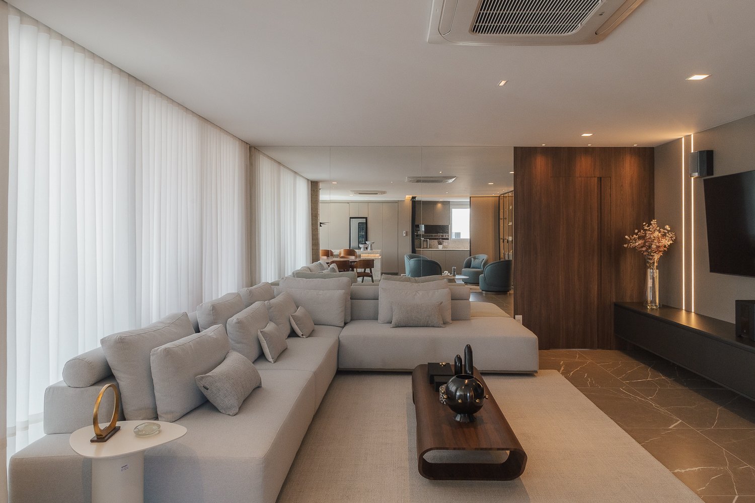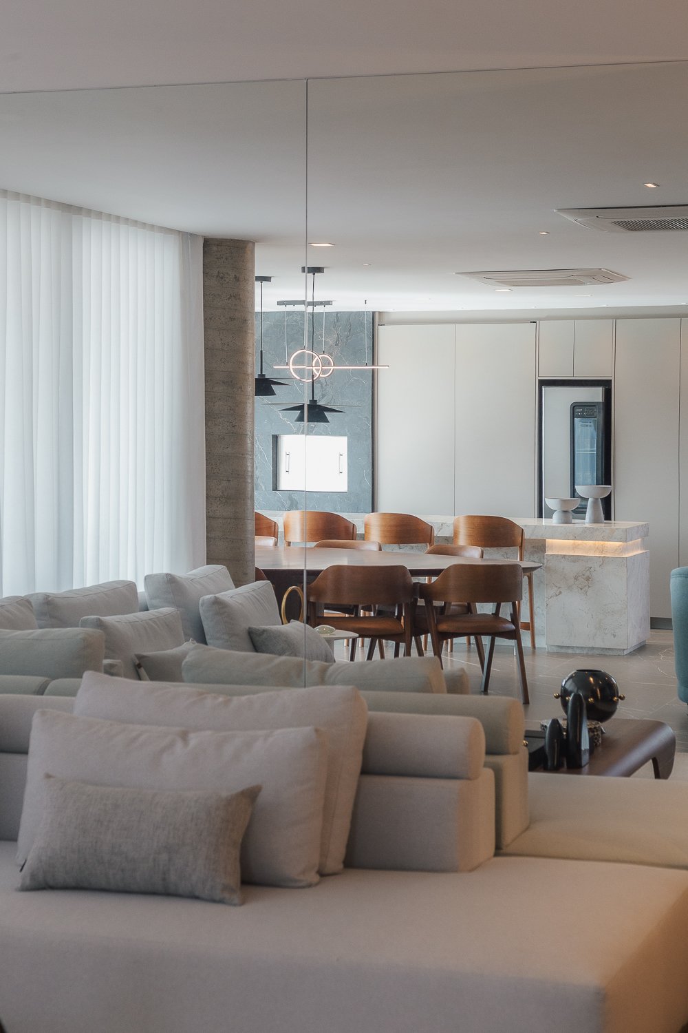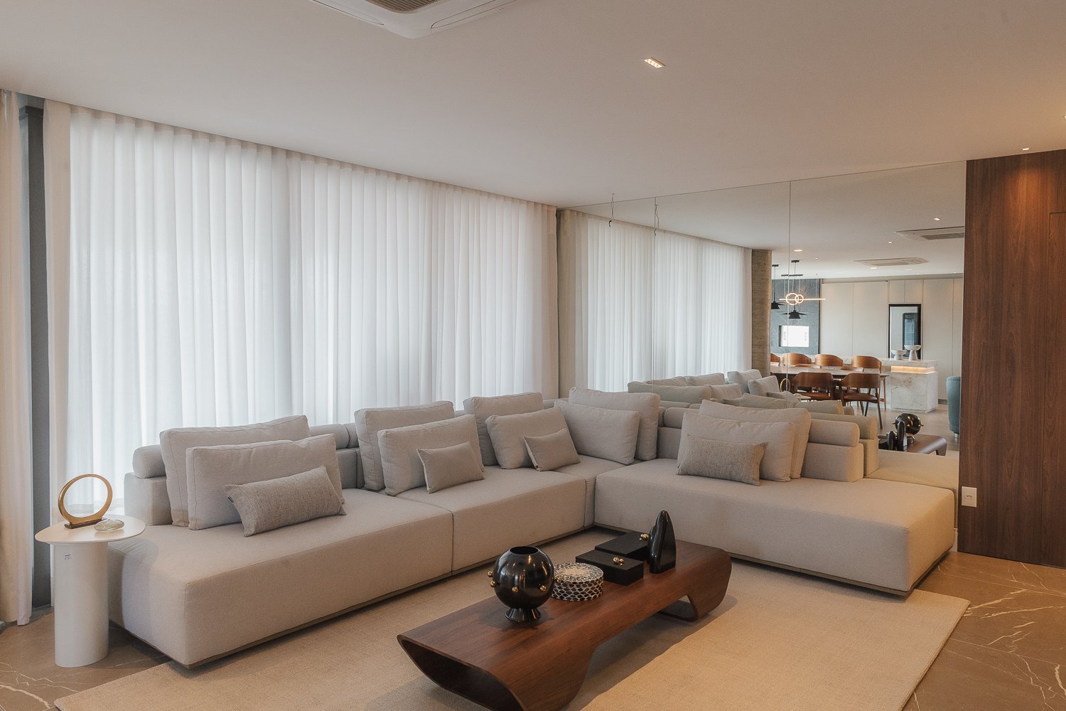 Nesse projeto de interiores que assinamos para esse apartamento apostamos em tons sóbrios, iluminação bem posicionada, uma composição entre dois tons de marmores e madeira natural. Esse conjunto de acabamentos no resultado final do projeto ficou com a essência que a família queria para a nova moradia, um lar aconchegante. A sala de TV alia conforto e elegância em um espaço contemporâneo com paleta neutra, sofá amplo em “L” e marcenaria sob medida. A iluminação indireta e o espelho ampliam o ambiente, enquanto os detalhes em madeira, preto e objetos decorativos trazem sofisticação e acolhimento. Um projeto funcional, fluido e visualmente equilibrado. Esta cozinha revela um projeto contemporâneo marcado pela elegância minimalista e funcionalidade. Os tons neutros predominam nos armários em acabamento fosco, que contrastam com o mármore claro das bancadas e paredes, conferindo sofisticação e atemporalidade ao espaço. A iluminação embutida no teto garante um ambiente bem iluminado, valorizando cada detalhe da marcenaria e do revestimento. A ampla janela permite entrada generosa de luz natural, além de oferecer uma vista livre, que amplia a sensação de espaço. O layout linear otimiza a circulação e a ergonomia no uso diário, com eletrodomésticos embutidos e organizados de forma eficiente. O visual limpo, sem puxadores aparentes, reforça o estilo moderno, enquanto os acabamentos de qualidade evidenciam o cuidado com cada escolha.