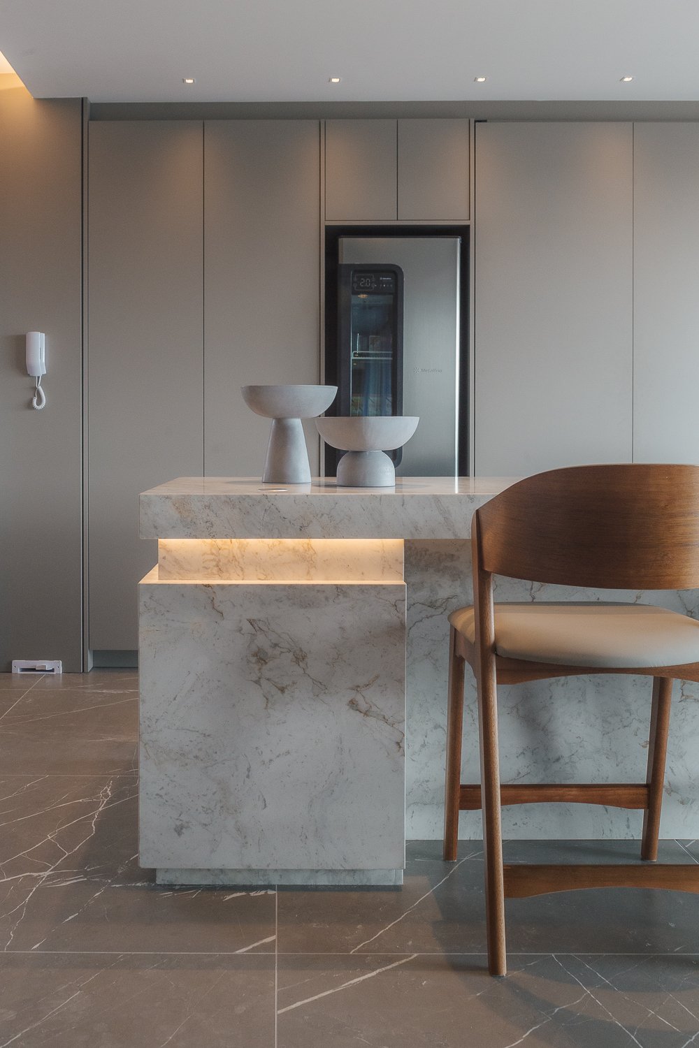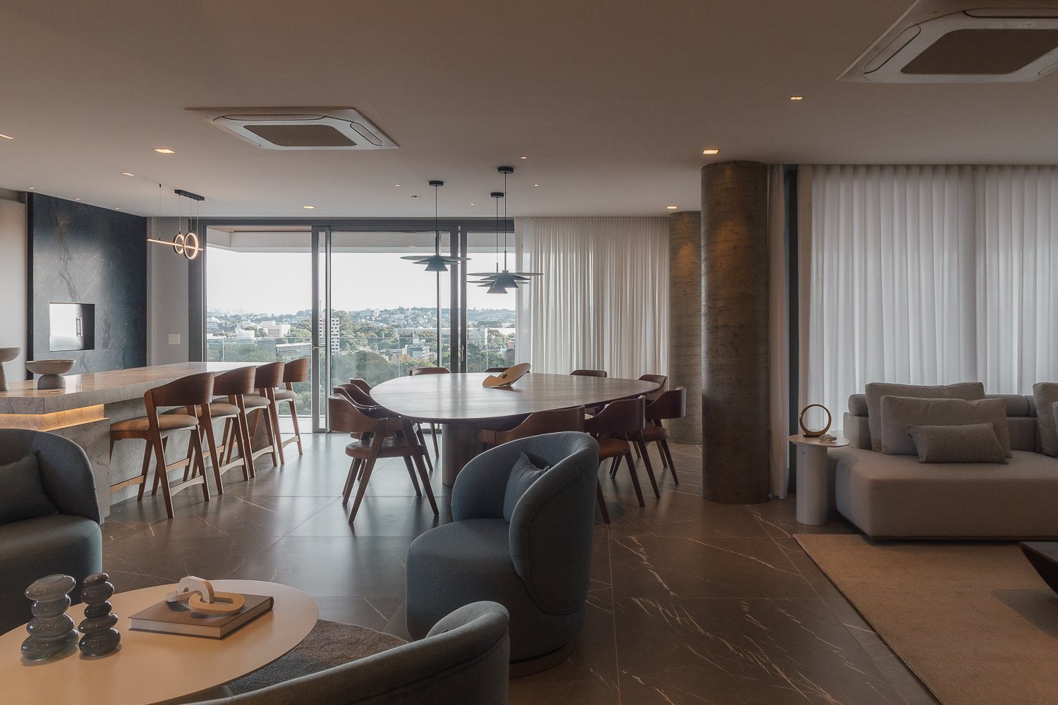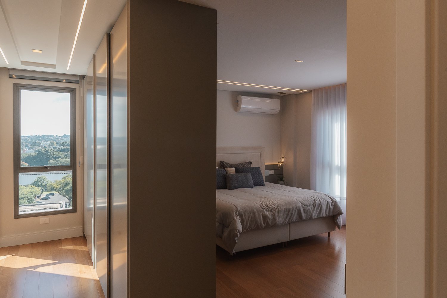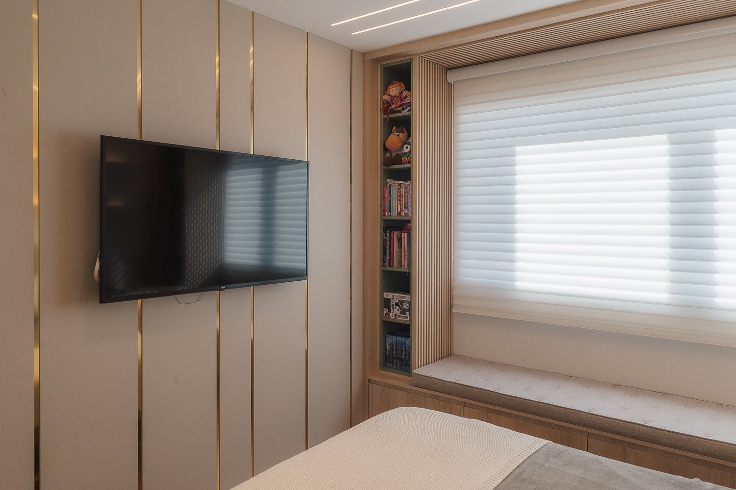 Nesse projeto de interiores que assinamos para esse apartamento apostamos em tons sóbrios, iluminação bem posicionada, uma composição entre dois tons de marmores e madeira natural. Esse conjunto de acabamentos no resultado final do projeto ficou com a essência que a família queria para a nova moradia, um lar aconchegante. A sala de TV alia conforto e elegância em um espaço contemporâneo com paleta neutra, sofá amplo em “L” e marcenaria sob medida. A iluminação indireta e o espelho ampliam o ambiente, enquanto os detalhes em madeira, preto e objetos decorativos trazem sofisticação e acolhimento. Um projeto funcional, fluido e visualmente equilibrado. Esta cozinha revela um projeto contemporâneo marcado pela elegância minimalista e funcionalidade. Os tons neutros predominam nos armários em acabamento fosco, que contrastam com o mármore claro das bancadas e paredes, conferindo sofisticação e atemporalidade ao espaço. A iluminação embutida no teto garante um ambiente bem iluminado, valorizando cada detalhe da marcenaria e do revestimento. A ampla janela permite entrada generosa de luz natural, além de oferecer uma vista livre, que amplia a sensação de espaço. O layout linear otimiza a circulação e a ergonomia no uso diário, com eletrodomésticos embutidos e organizados de forma eficiente. O visual limpo, sem puxadores aparentes, reforça o estilo moderno, enquanto os acabamentos de qualidade evidenciam o cuidado com cada escolha.