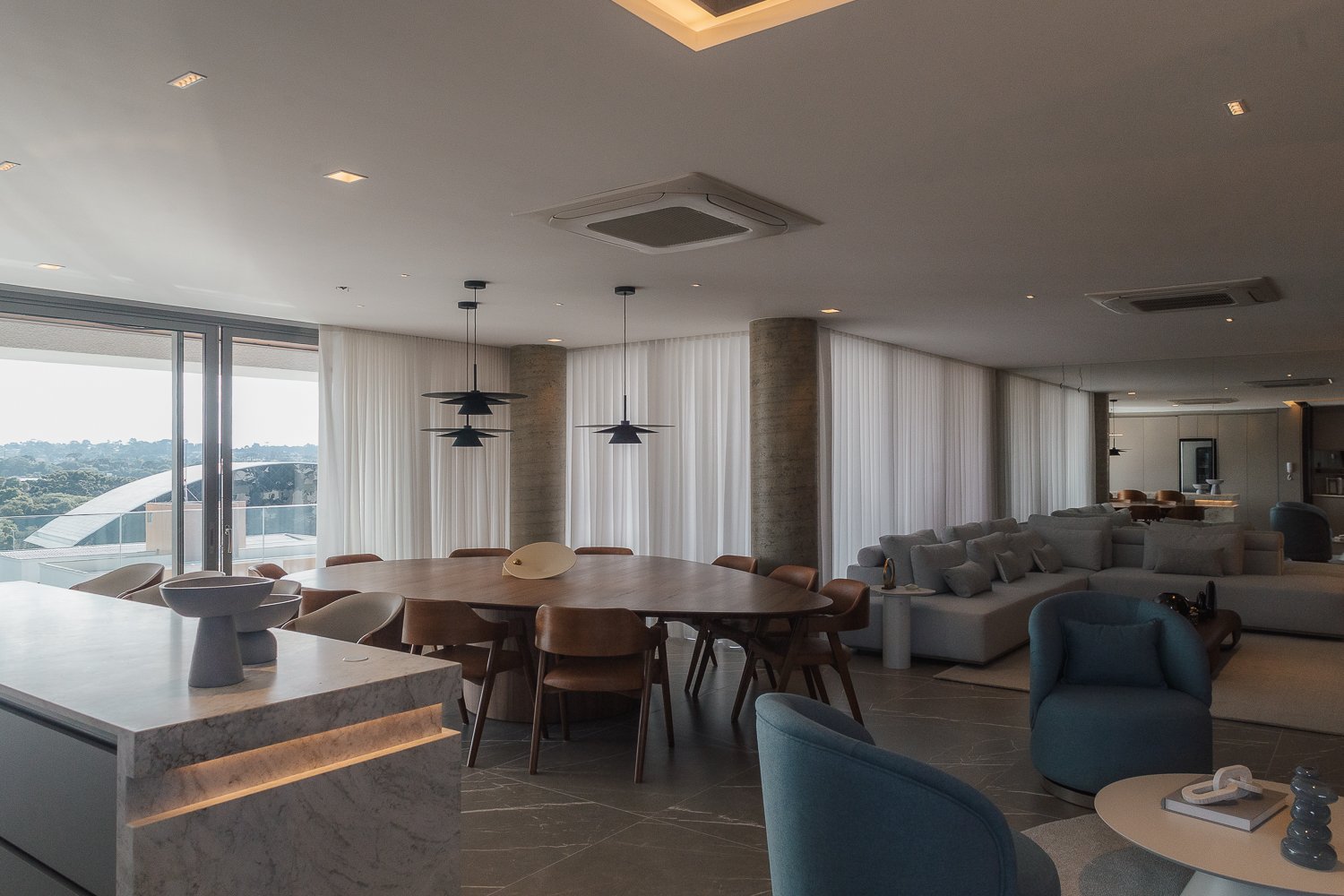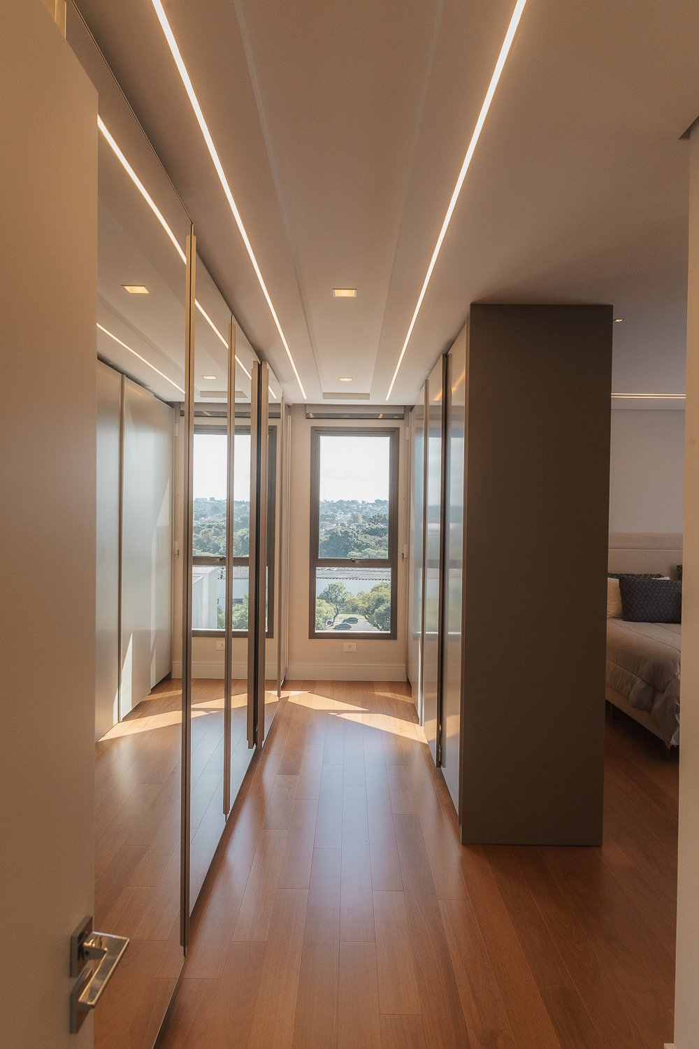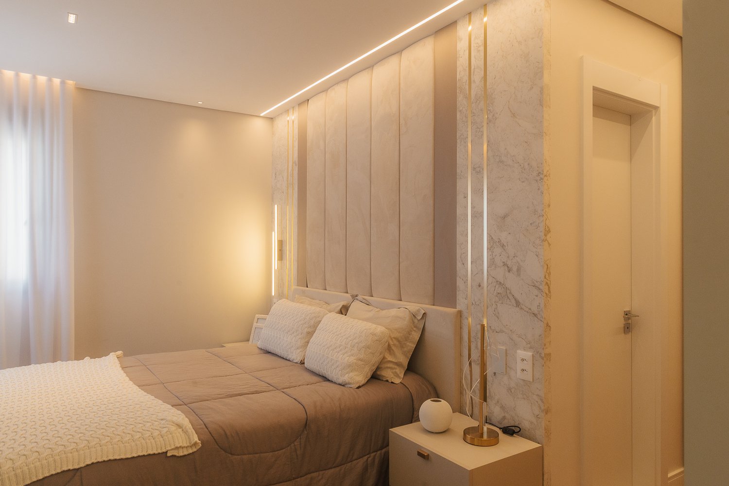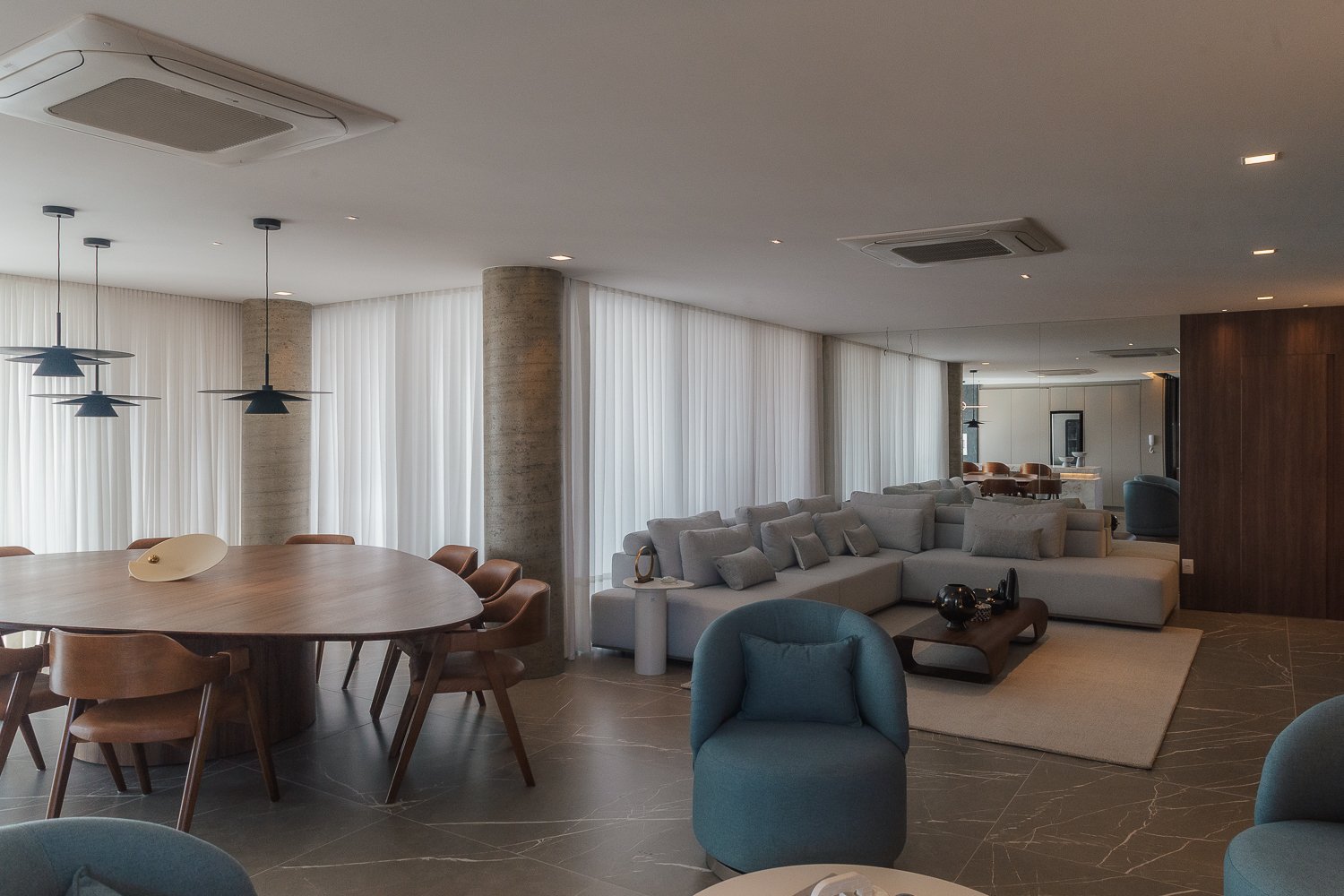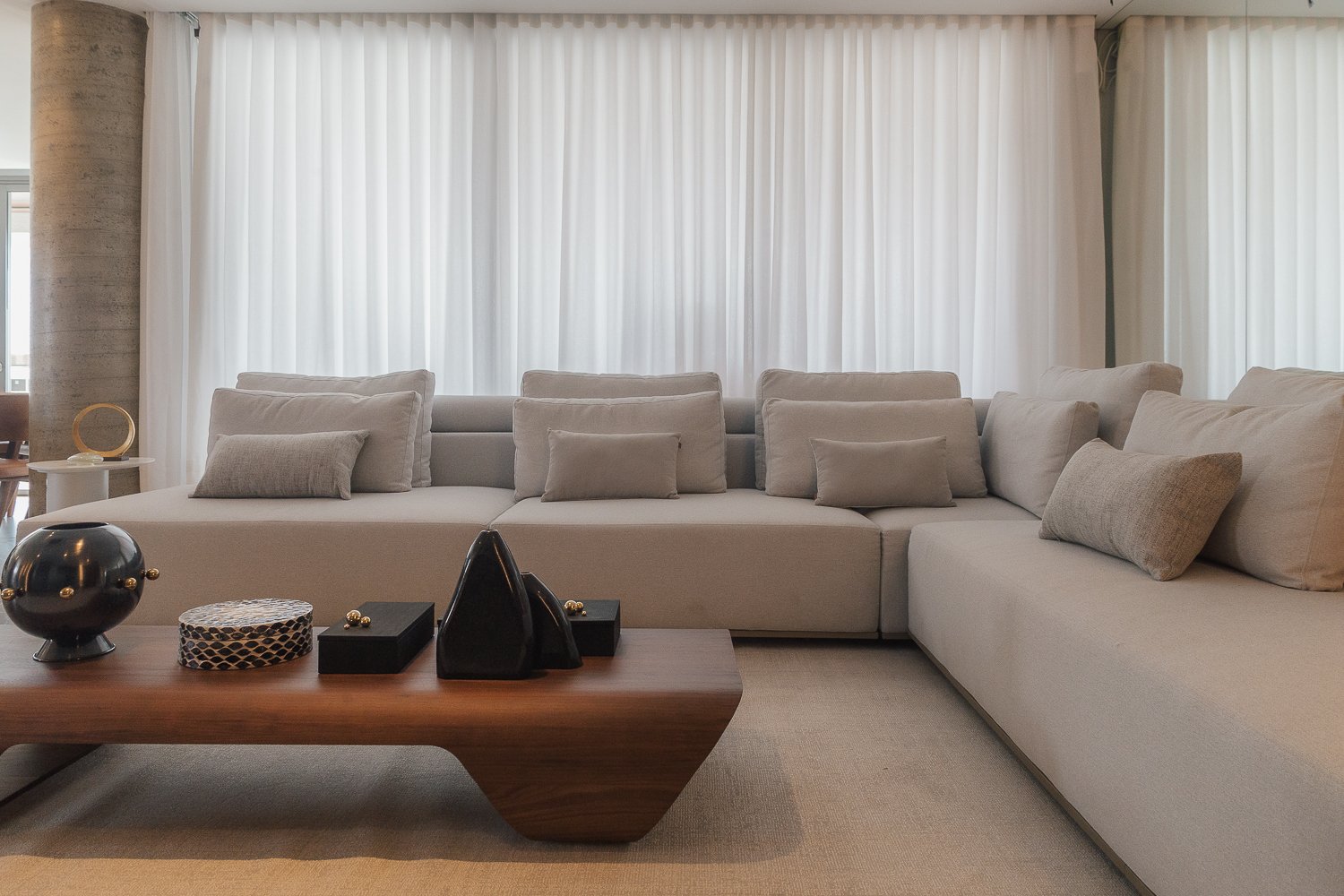 Nesse projeto de interiores que assinamos para esse apartamento apostamos em tons sóbrios, iluminação bem posicionada, uma composição entre dois tons de marmores e madeira natural. Esse conjunto de acabamentos no resultado final do projeto ficou com a essência que a família queria para a nova moradia, um lar aconchegante. A sala de TV alia conforto e elegância em um espaço contemporâneo com paleta neutra, sofá amplo em “L” e marcenaria sob medida. A iluminação indireta e o espelho ampliam o ambiente, enquanto os detalhes em madeira, preto e objetos decorativos trazem sofisticação e acolhimento. Um projeto funcional, fluido e visualmente equilibrado. Esta cozinha revela um projeto contemporâneo marcado pela elegância minimalista e funcionalidade. Os tons neutros predominam nos armários em acabamento fosco, que contrastam com o mármore claro das bancadas e paredes, conferindo sofisticação e atemporalidade ao espaço. A iluminação embutida no teto garante um ambiente bem iluminado, valorizando cada detalhe da marcenaria e do revestimento. A ampla janela permite entrada generosa de luz natural, além de oferecer uma vista livre, que amplia a sensação de espaço. O layout linear otimiza a circulação e a ergonomia no uso diário, com eletrodomésticos embutidos e organizados de forma eficiente. O visual limpo, sem puxadores aparentes, reforça o estilo moderno, enquanto os acabamentos de qualidade evidenciam o cuidado com cada escolha.