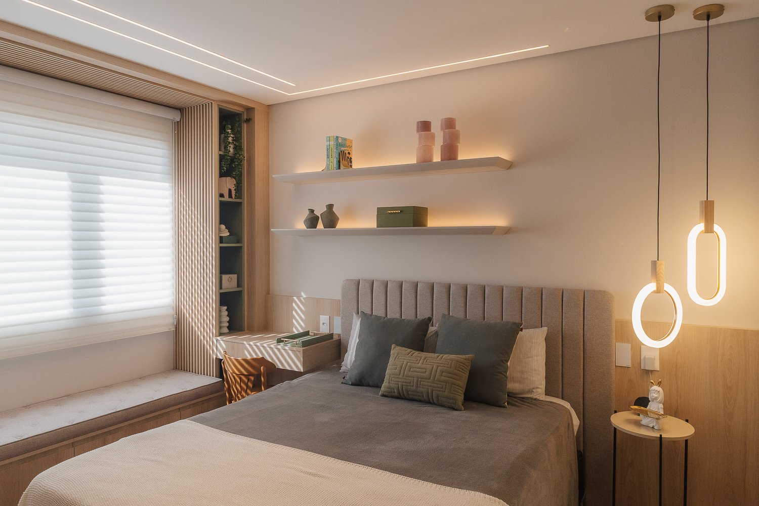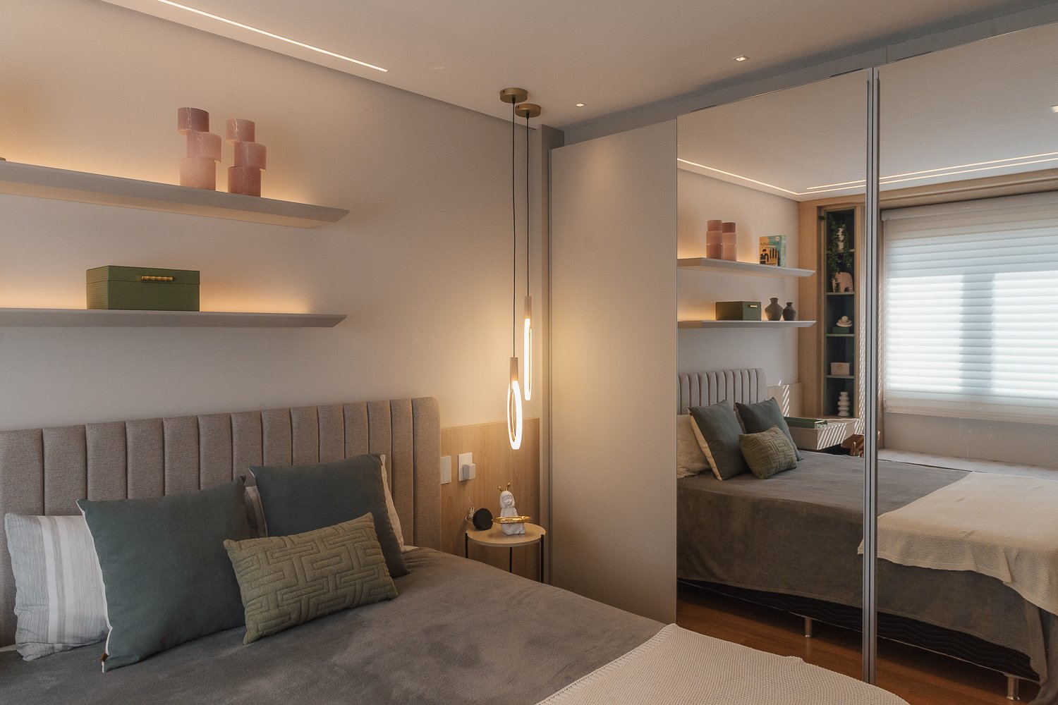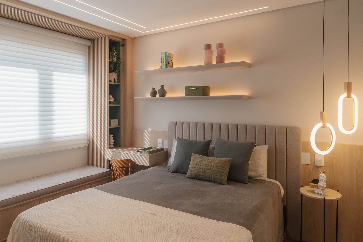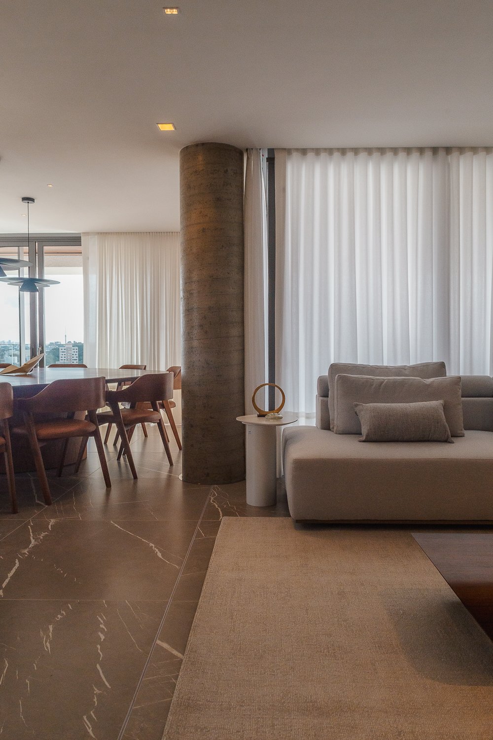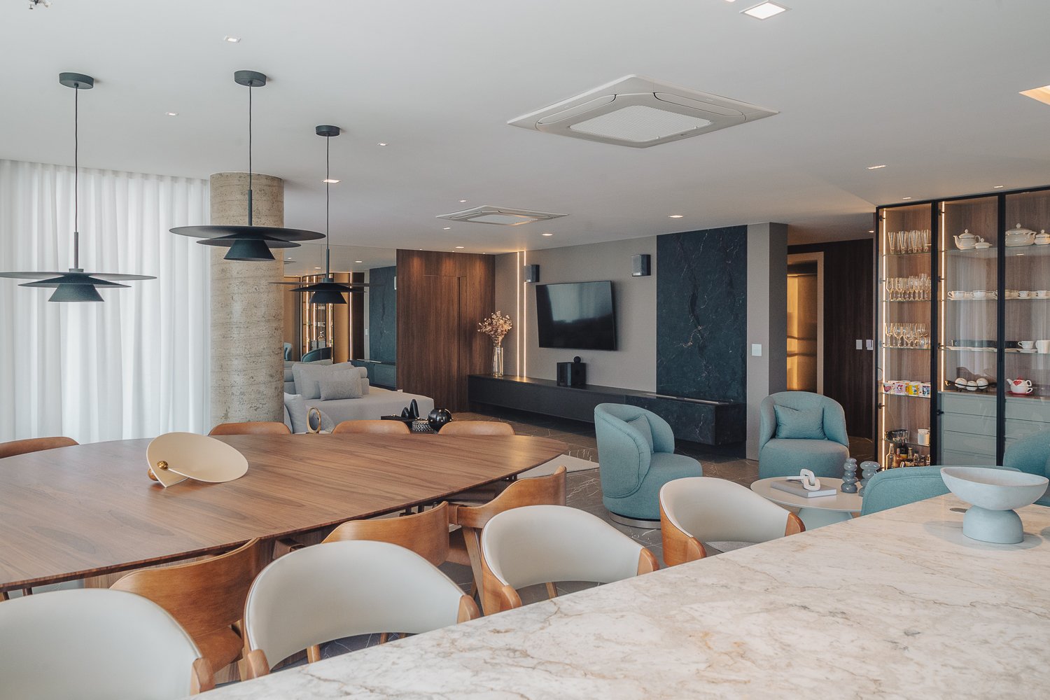Nesse projeto de interiores que assinamos para esse apartamento apostamos em tons sóbrios, iluminação bem posicionada, uma composição entre dois tons de marmores e madeira natural. Esse conjunto de acabamentos no resultado final do projeto ficou com a essência que a família queria para a nova moradia, um lar aconchegante. A sala de TV alia conforto e elegância em um espaço contemporâneo com paleta neutra, sofá amplo em “L” e marcenaria sob medida. A iluminação indireta e o espelho ampliam o ambiente, enquanto os detalhes em madeira, preto e objetos decorativos trazem sofisticação e acolhimento. Um projeto funcional, fluido e visualmente equilibrado. Esta cozinha revela um projeto contemporâneo marcado pela elegância minimalista e funcionalidade. Os tons neutros predominam nos armários em acabamento fosco, que contrastam com o mármore claro das bancadas e paredes, conferindo sofisticação e atemporalidade ao espaço. A iluminação embutida no teto garante um ambiente bem iluminado, valorizando cada detalhe da marcenaria e do revestimento. A ampla janela permite entrada generosa de luz natural, além de oferecer uma vista livre, que amplia a sensação de espaço. O layout linear otimiza a circulação e a ergonomia no uso diário, com eletrodomésticos embutidos e organizados de forma eficiente. O visual limpo, sem puxadores aparentes, reforça o estilo moderno, enquanto os acabamentos de qualidade evidenciam o cuidado com cada escolha.