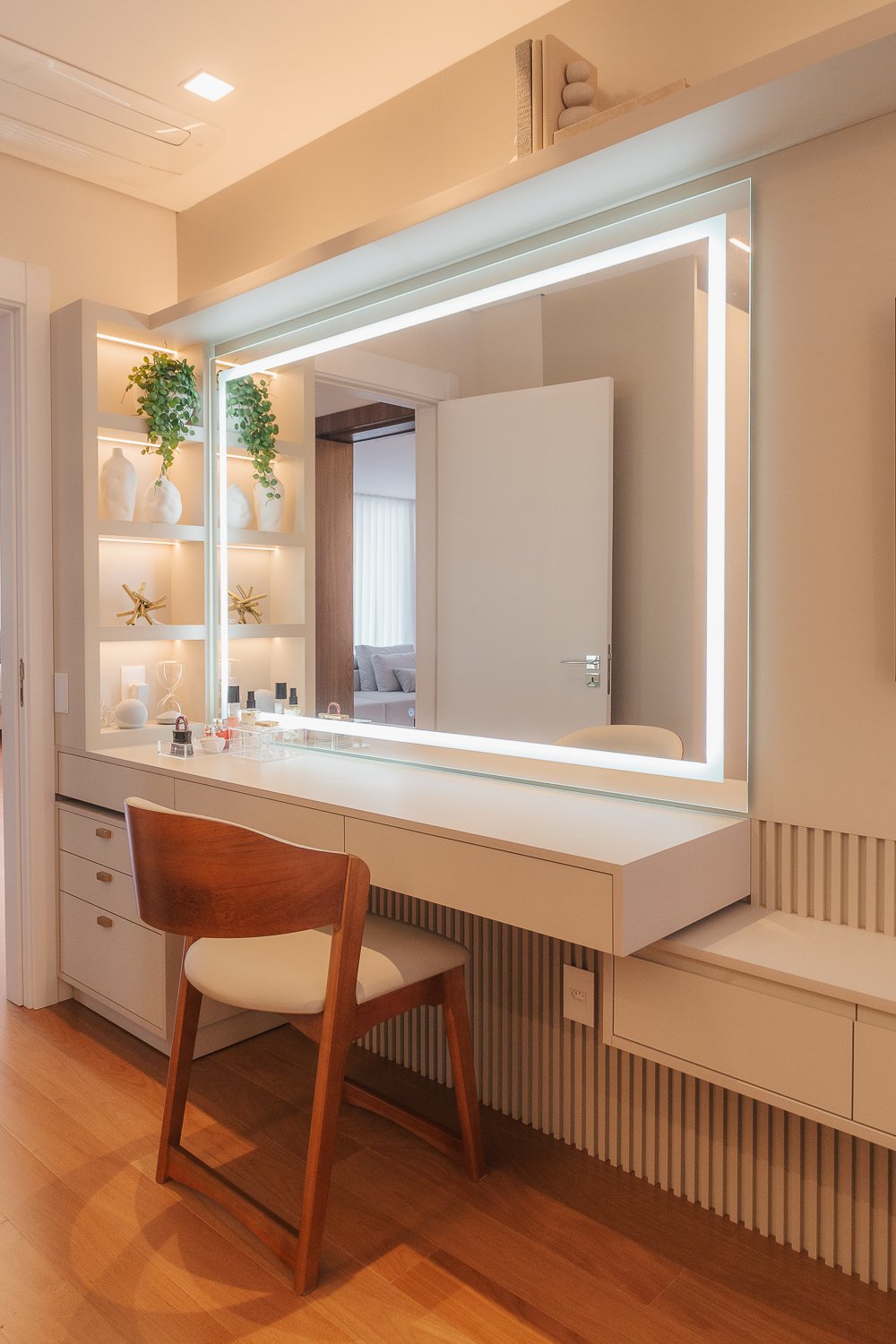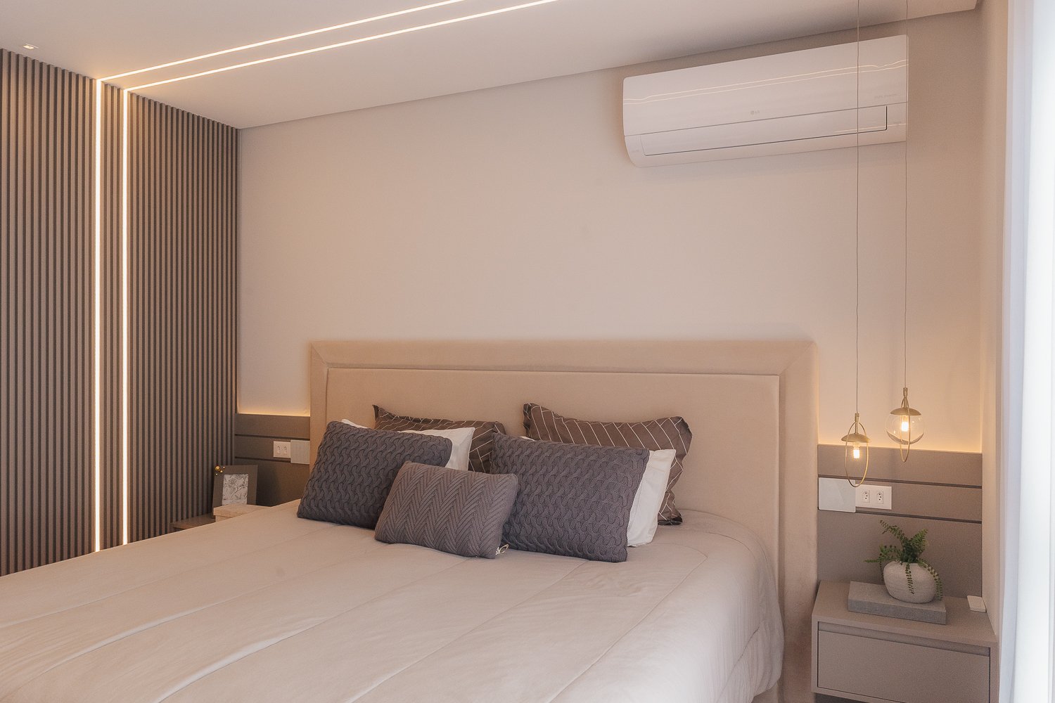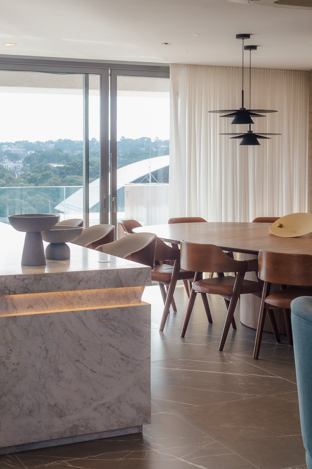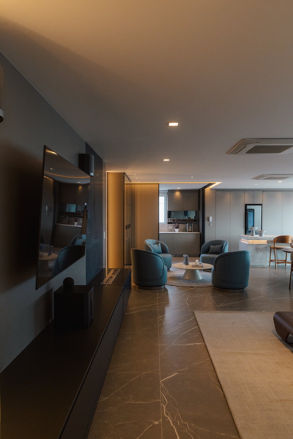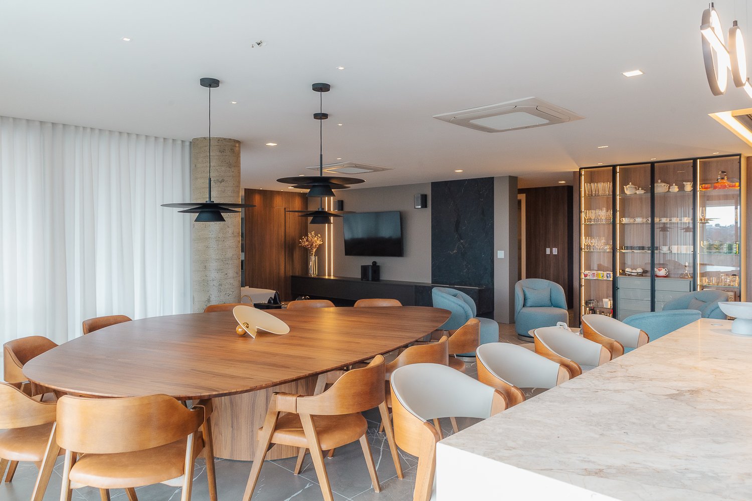 Nesse projeto de interiores que assinamos para esse apartamento apostamos em tons sóbrios, iluminação bem posicionada, uma composição entre dois tons de marmores e madeira natural. Esse conjunto de acabamentos no resultado final do projeto ficou com a essência que a família queria para a nova moradia, um lar aconchegante. A sala de TV alia conforto e elegância em um espaço contemporâneo com paleta neutra, sofá amplo em “L” e marcenaria sob medida. A iluminação indireta e o espelho ampliam o ambiente, enquanto os detalhes em madeira, preto e objetos decorativos trazem sofisticação e acolhimento. Um projeto funcional, fluido e visualmente equilibrado. Esta cozinha revela um projeto contemporâneo marcado pela elegância minimalista e funcionalidade. Os tons neutros predominam nos armários em acabamento fosco, que contrastam com o mármore claro das bancadas e paredes, conferindo sofisticação e atemporalidade ao espaço. A iluminação embutida no teto garante um ambiente bem iluminado, valorizando cada detalhe da marcenaria e do revestimento. A ampla janela permite entrada generosa de luz natural, além de oferecer uma vista livre, que amplia a sensação de espaço. O layout linear otimiza a circulação e a ergonomia no uso diário, com eletrodomésticos embutidos e organizados de forma eficiente. O visual limpo, sem puxadores aparentes, reforça o estilo moderno, enquanto os acabamentos de qualidade evidenciam o cuidado com cada escolha.