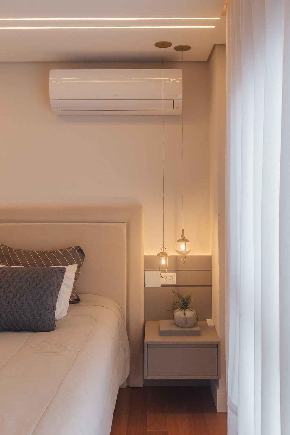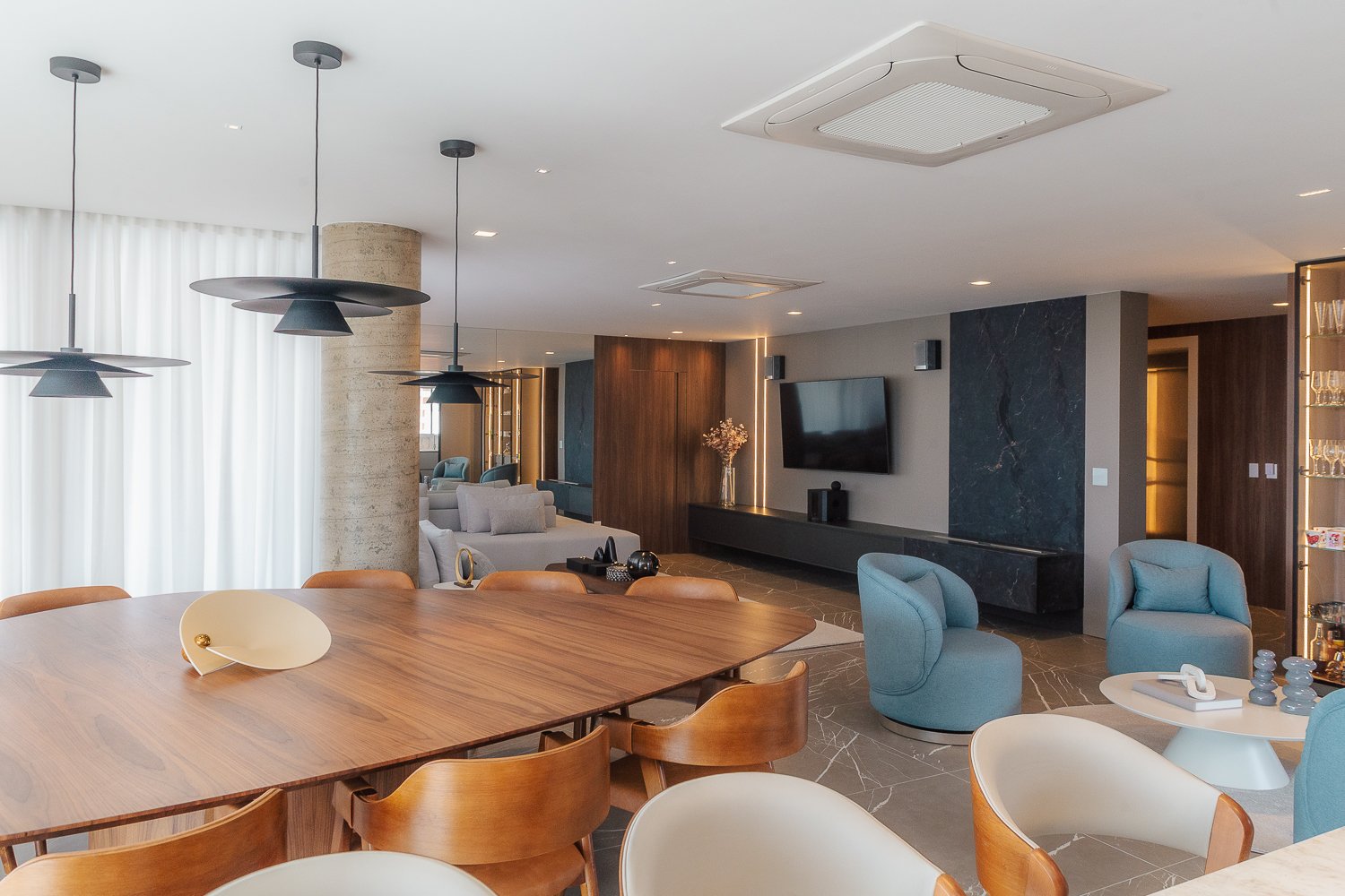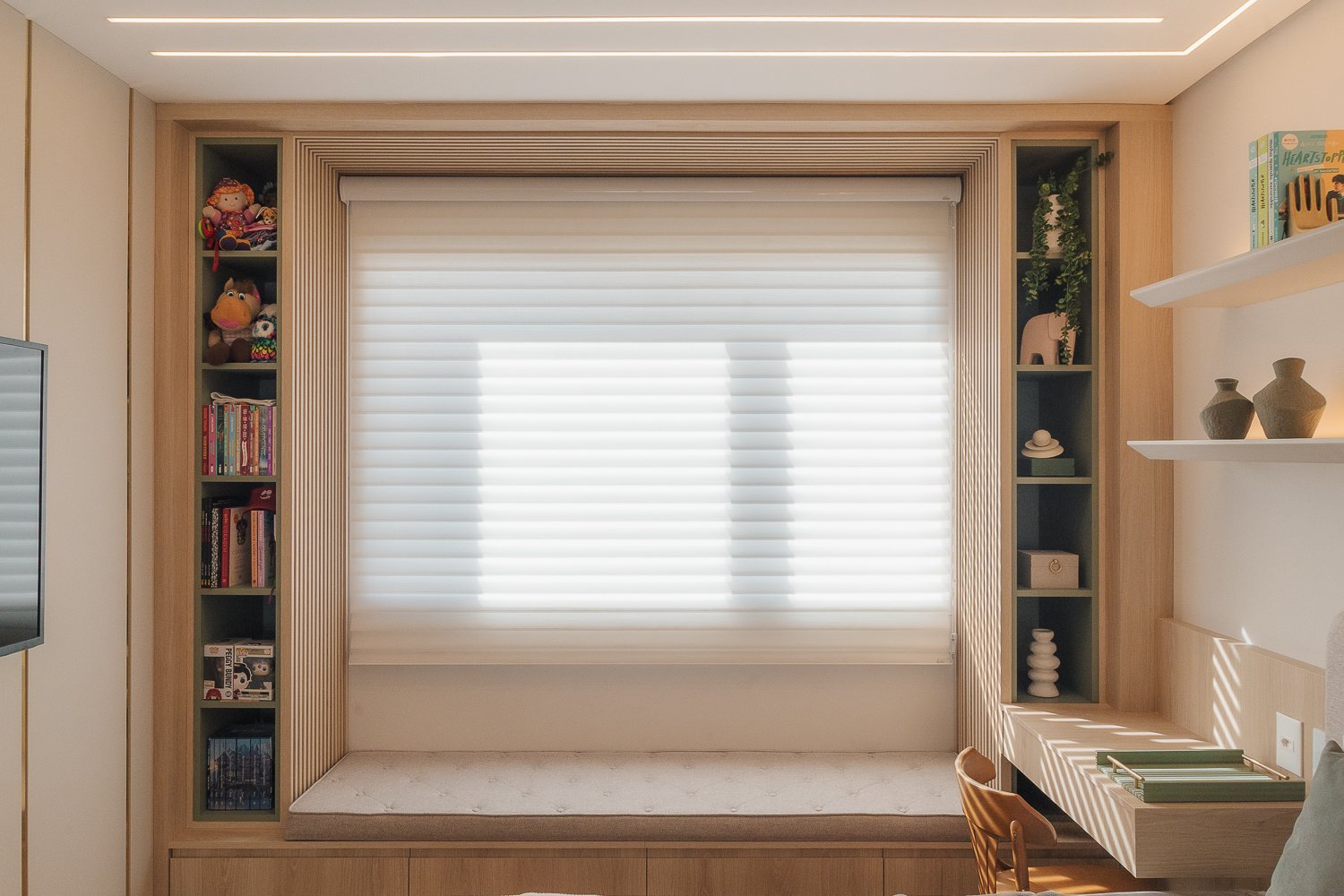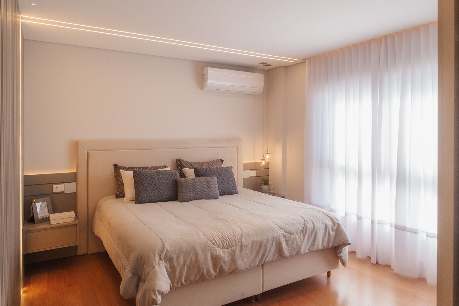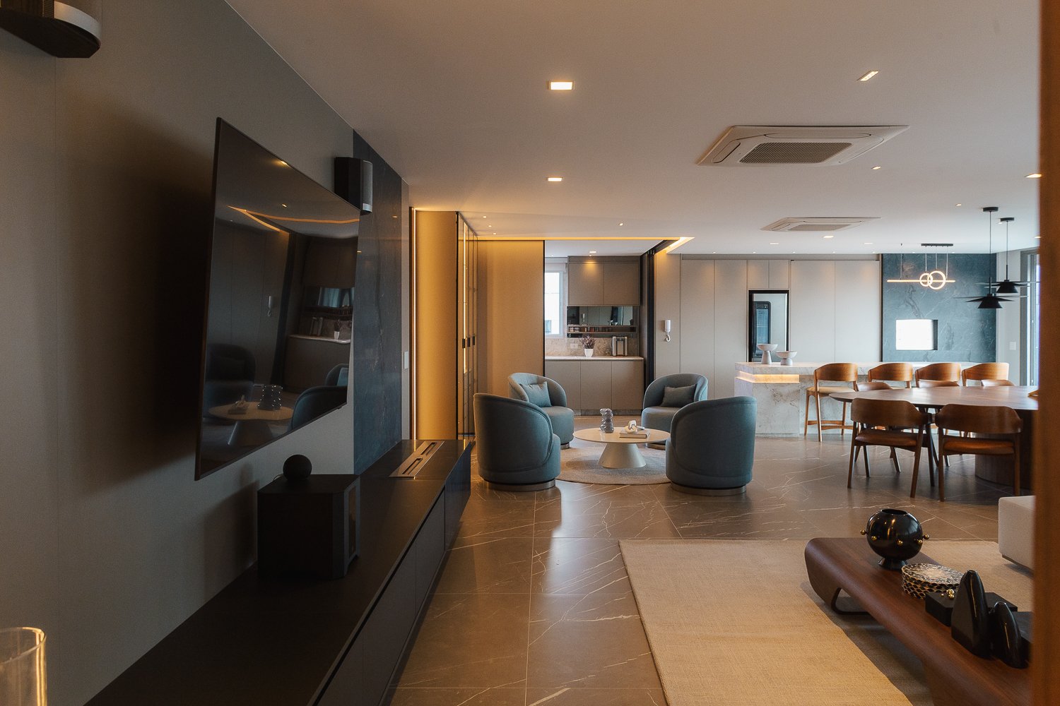 Nesse projeto de interiores que assinamos para esse apartamento apostamos em tons sóbrios, iluminação bem posicionada, uma composição entre dois tons de marmores e madeira natural. Esse conjunto de acabamentos no resultado final do projeto ficou com a essência que a família queria para a nova moradia, um lar aconchegante. A sala de TV alia conforto e elegância em um espaço contemporâneo com paleta neutra, sofá amplo em “L” e marcenaria sob medida. A iluminação indireta e o espelho ampliam o ambiente, enquanto os detalhes em madeira, preto e objetos decorativos trazem sofisticação e acolhimento. Um projeto funcional, fluido e visualmente equilibrado. Esta cozinha revela um projeto contemporâneo marcado pela elegância minimalista e funcionalidade. Os tons neutros predominam nos armários em acabamento fosco, que contrastam com o mármore claro das bancadas e paredes, conferindo sofisticação e atemporalidade ao espaço. A iluminação embutida no teto garante um ambiente bem iluminado, valorizando cada detalhe da marcenaria e do revestimento. A ampla janela permite entrada generosa de luz natural, além de oferecer uma vista livre, que amplia a sensação de espaço. O layout linear otimiza a circulação e a ergonomia no uso diário, com eletrodomésticos embutidos e organizados de forma eficiente. O visual limpo, sem puxadores aparentes, reforça o estilo moderno, enquanto os acabamentos de qualidade evidenciam o cuidado com cada escolha.