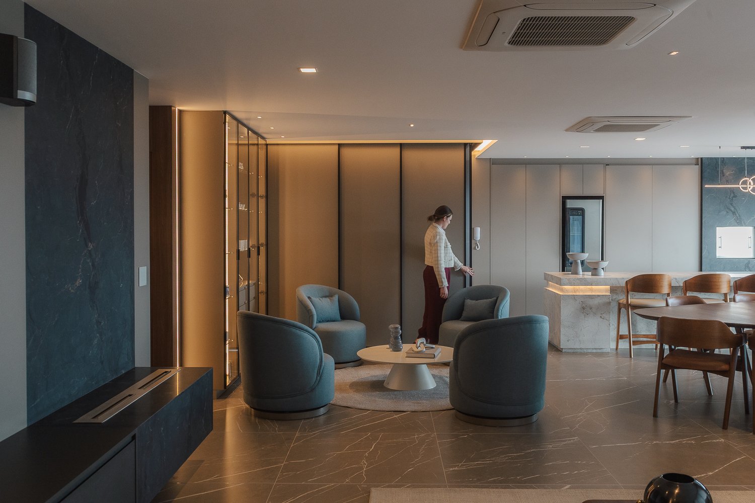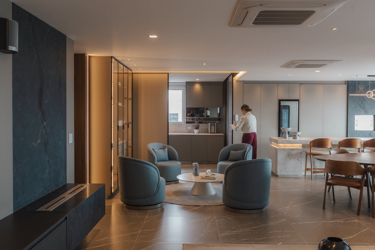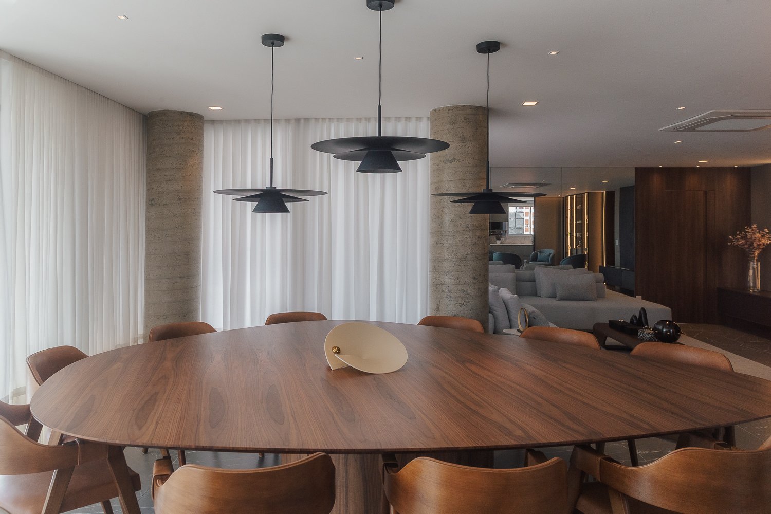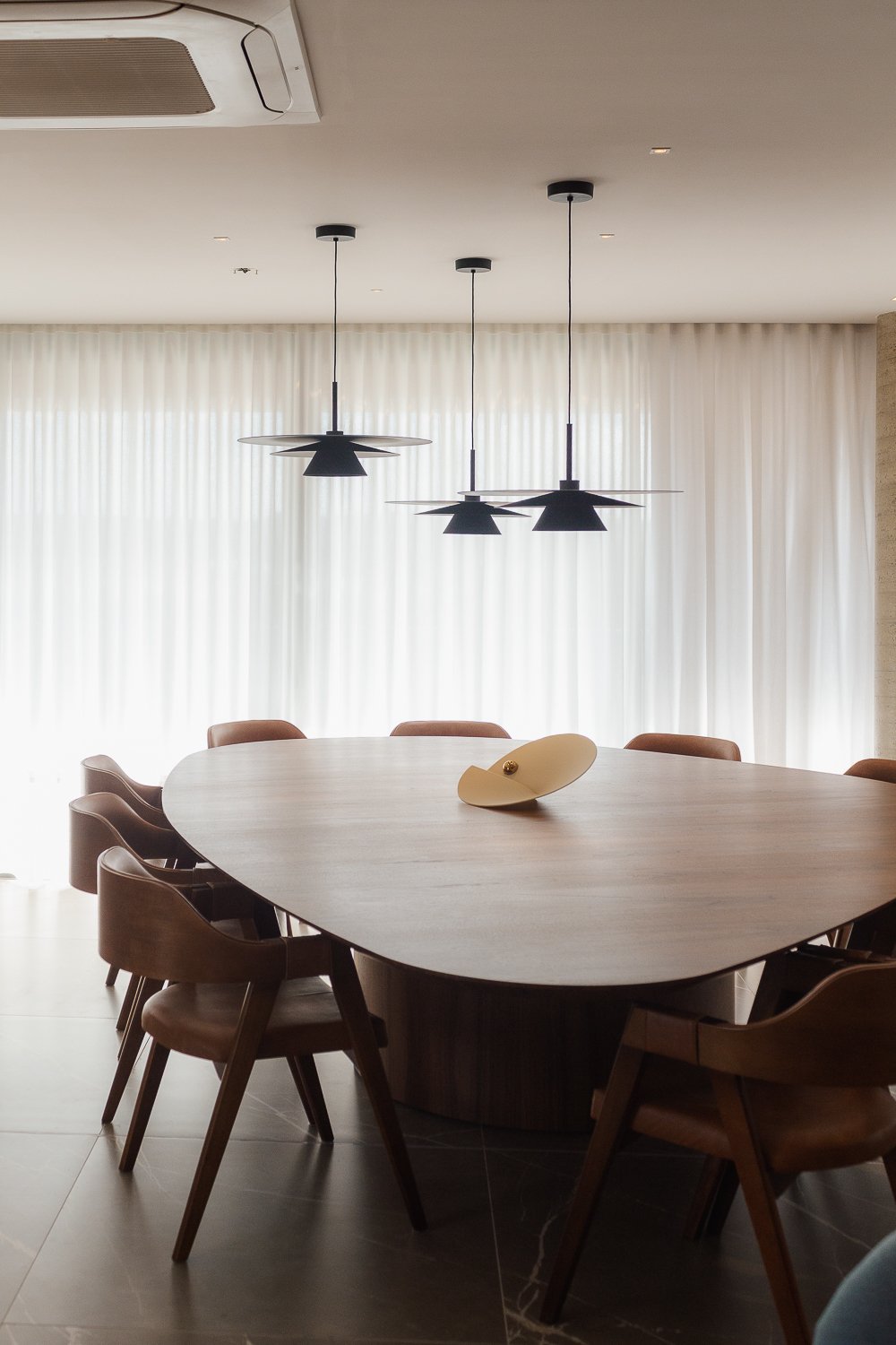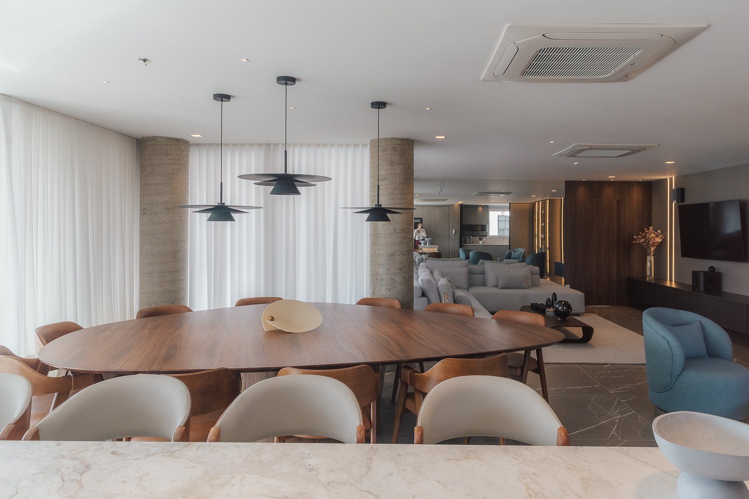 Nesse projeto de interiores que assinamos para esse apartamento apostamos em tons sóbrios, iluminação bem posicionada, uma composição entre dois tons de marmores e madeira natural. Esse conjunto de acabamentos no resultado final do projeto ficou com a essência que a família queria para a nova moradia, um lar aconchegante. A sala de TV alia conforto e elegância em um espaço contemporâneo com paleta neutra, sofá amplo em “L” e marcenaria sob medida. A iluminação indireta e o espelho ampliam o ambiente, enquanto os detalhes em madeira, preto e objetos decorativos trazem sofisticação e acolhimento. Um projeto funcional, fluido e visualmente equilibrado. Esta cozinha revela um projeto contemporâneo marcado pela elegância minimalista e funcionalidade. Os tons neutros predominam nos armários em acabamento fosco, que contrastam com o mármore claro das bancadas e paredes, conferindo sofisticação e atemporalidade ao espaço. A iluminação embutida no teto garante um ambiente bem iluminado, valorizando cada detalhe da marcenaria e do revestimento. A ampla janela permite entrada generosa de luz natural, além de oferecer uma vista livre, que amplia a sensação de espaço. O layout linear otimiza a circulação e a ergonomia no uso diário, com eletrodomésticos embutidos e organizados de forma eficiente. O visual limpo, sem puxadores aparentes, reforça o estilo moderno, enquanto os acabamentos de qualidade evidenciam o cuidado com cada escolha.
